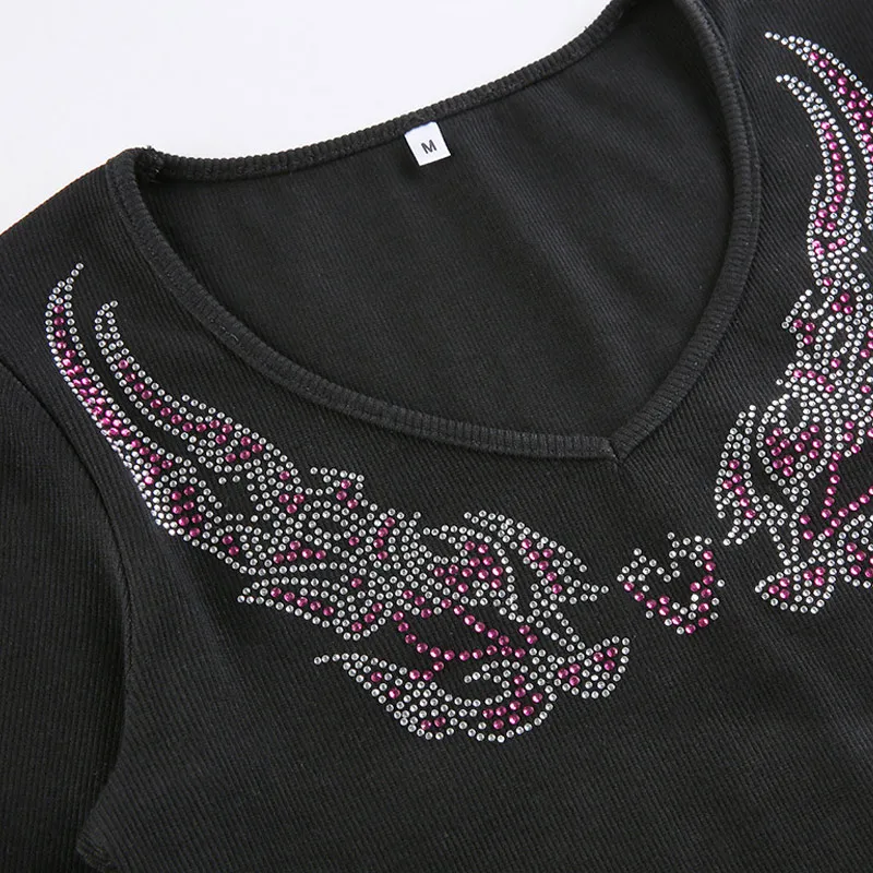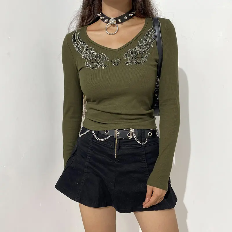Женская футболка в рубчик, с длинным рукавом и V-образным вырезом, стразы, 2021