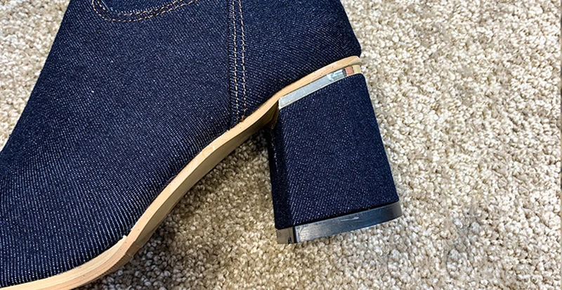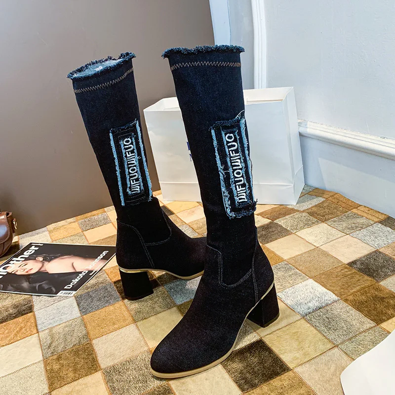 Женские винтажные джинсовые сапоги, высокие эластичные сапоги с вышитыми буквами на высоком каблуке, модные повседневные женские сапоги