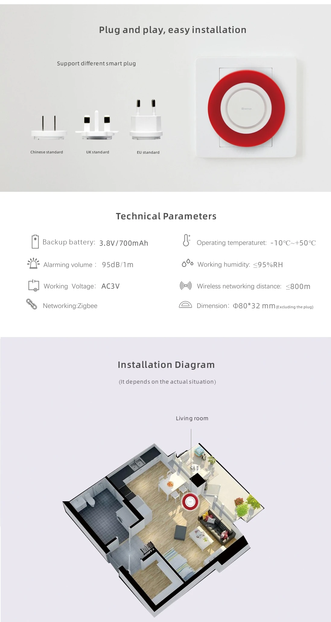 Эта умная сирена использует сетевой режим Zigbee3.0. Когда сигнализация срабатывает внутри дома, эта умная сирена выдаст звук высокого децибел и вспышку, А также своевременно и эффективно отправлять информацию о тревоге пользователю, чтобы помочь пользователю своевременно справиться с аварийной ситуацией.