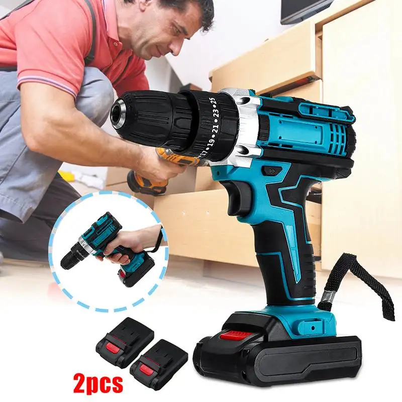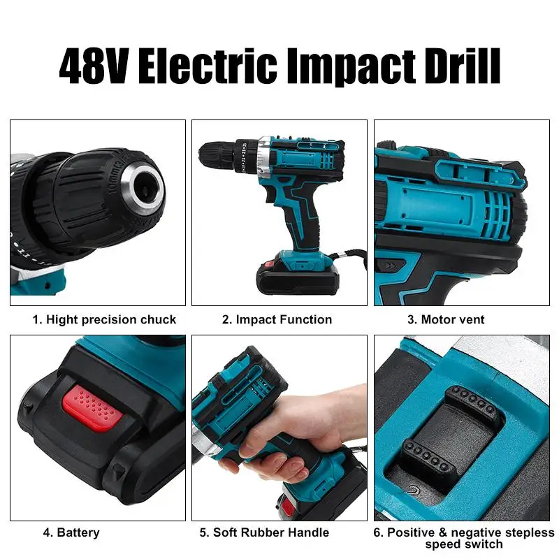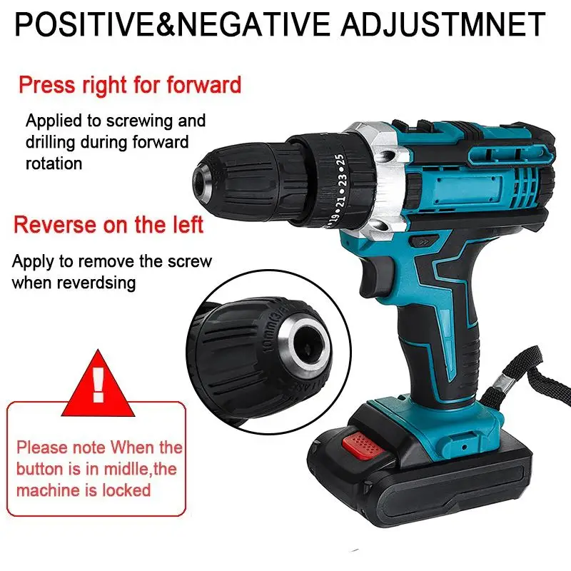 Посылка включает в себя:1 электрическая дрель1 или 2 батареи1 зарядное устройство (штепсельная вилка США, мы отправим вам адаптер в соответствии с вашей страной)Особенности-Питание от литий-ионной аккумуляторной батареи, обеспечивает более длительное время работы и большую мощность-Высокая эффективность двигателя, обеспечивает до 28N. М крутящего момента и 0-1450r/мин скорости-Сверлильный патрон для быстрой и простой замены бит-Использование вперед/обратный переключатель, 25-скорости крутящего момента-Переключатель вперед/назад может быть установлен в трех положениях:Вперед, назад и замок. Из-за блокировочного механизма, передний/обратный переключатель может быть отрегулирован только при отсутствии нажатия на триггер. Перед использованием переключателя вперед/назад двигатель всегда должен полностью останавливаться.-Светодиодный Светильник обеспечивает освещение в темных пространствах при работе-Эргономичная и удобная ручка обеспечивает идеальный баланс и контроль инструмента-3 этапа настройки: ударное сверление, плоское сверление и поворотные винтыПредупреждениеЧтобы уменьшить риск травм, надевайте защитные очки или очки с боковыми щитами.Спецификация:1. Название: электрическая дрель2. Цвет: синий3. Напряжение батареи: 48 В4. Максимальный крутящий момент: 25-28 нм5 Скорость без нагрузки: 0-450р/мин, 0-1450р/мин6. Вход: 110-240 в 50-60 Гц7. Выход: 1.3A8. Размер: прибл. 21x19x10см