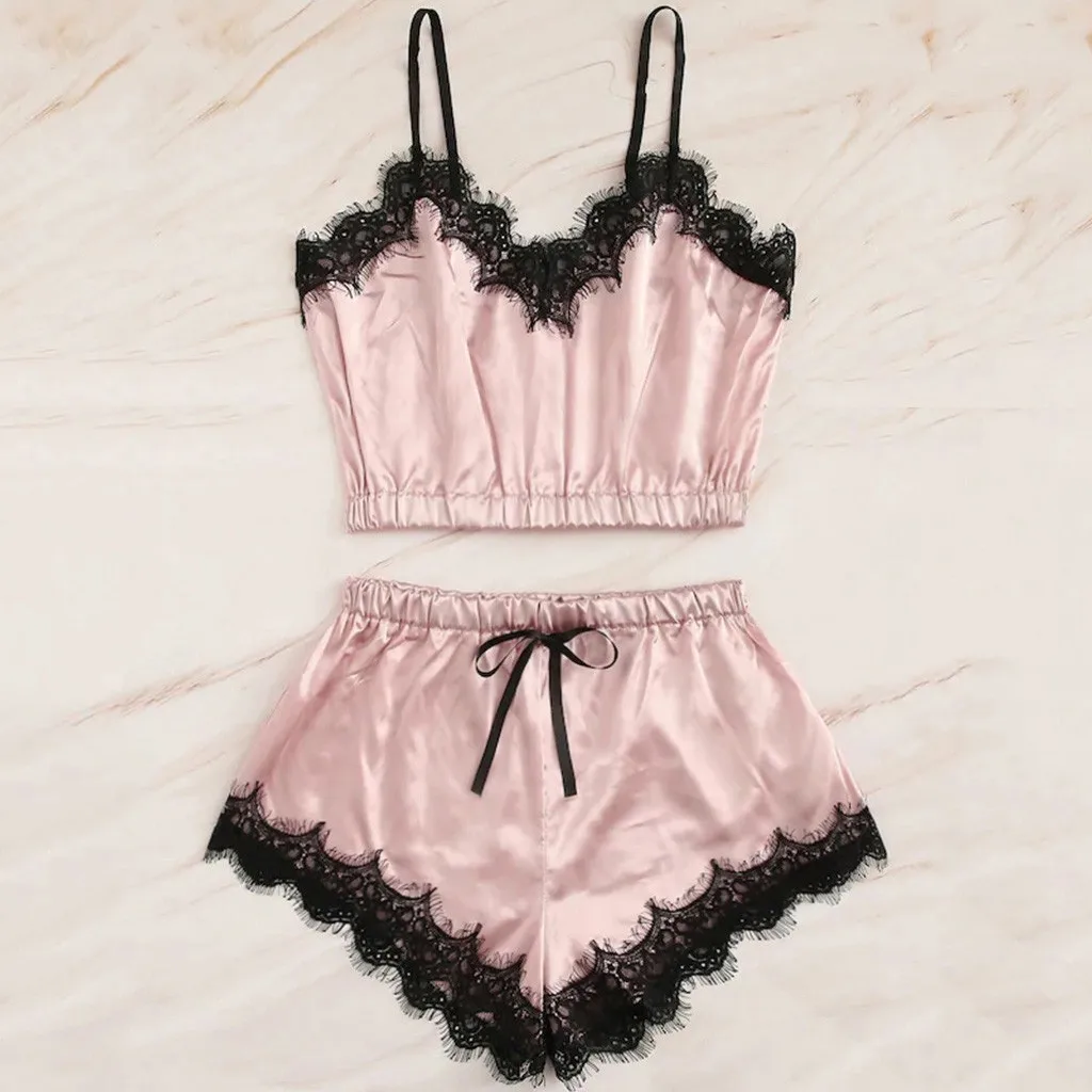 Пикантное нижнее белье, Эротическая ночная рубашка, кружевной Атласный топ на бретельках, пижамный комплект