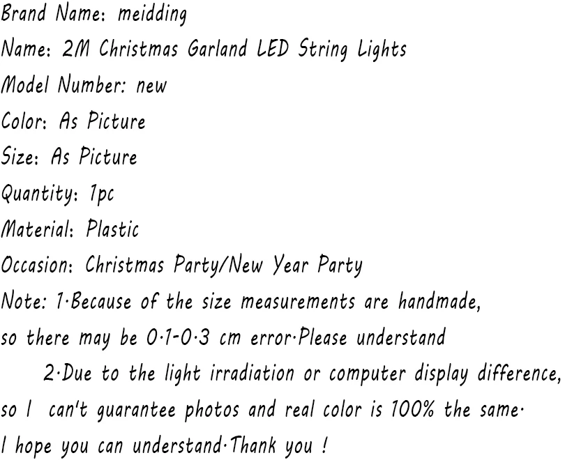 Название бренда: meiddingНазвание: 2 м Рождественская гирлянда светодиодный гирляндаНомер модели: новыйЦвет: как на фотоРазмер: как на картинкеКоличество: 1 шт.Материал: пластикПовод: Рождественская вечеринка/Новогодняя вечеринка