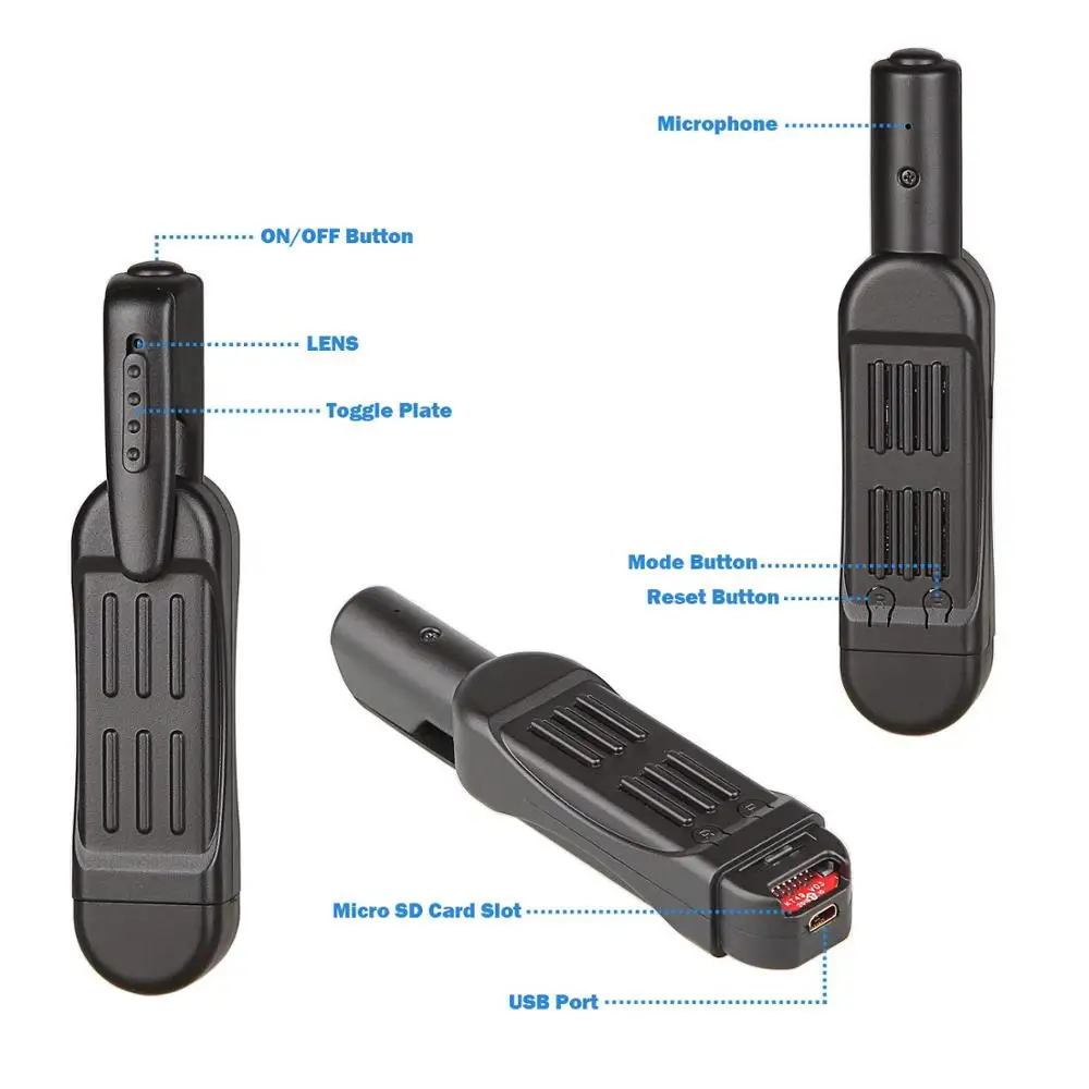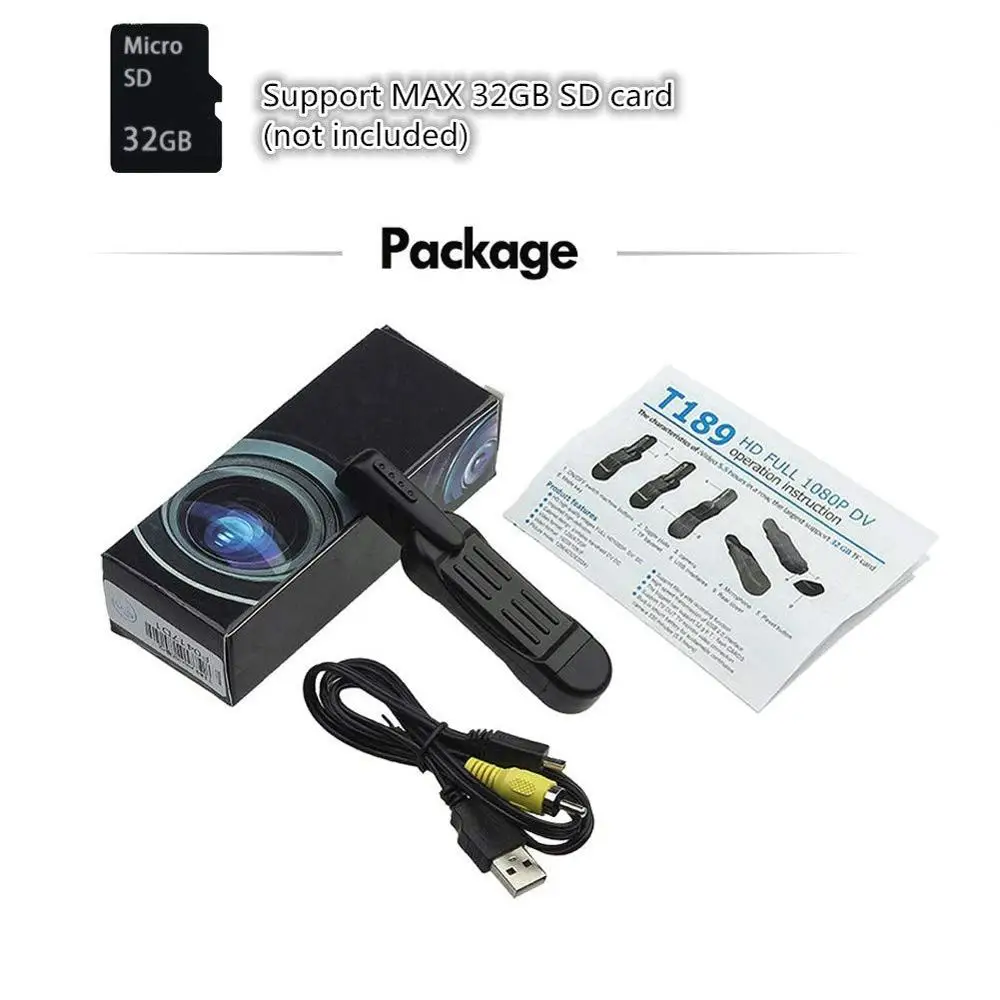 Модель: T189Материал: пластикРазрешение видео: 1280x720P, 1920x1080PПиксель: 12 мФормат видео: AVIКодирование видео: M-JPEGФормат изображения: JPGПропорция изображения: 4:3Напряжение зарядки: 5 В постоянного токаОбъем памяти: Micro SD карта (TF карта), до 32 Гб (не входит в комплект)Тип батареи: литий-полимерный аккумуляторЕмкость аккумулятора: 850мАВремя зарядки: около 3,0 часовИнтерфейс: MINI 8Pin USB, слот для tf-картыVista, Mac OS, LinuxРазмер: 10.8x2.3x2cmВес: 35 гОперационная система: Windows 2000, Windows 2003, Windows XP, Windows ME, Windows