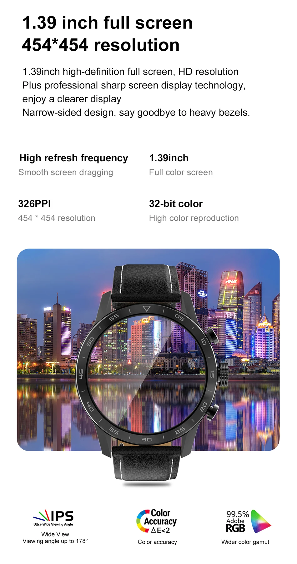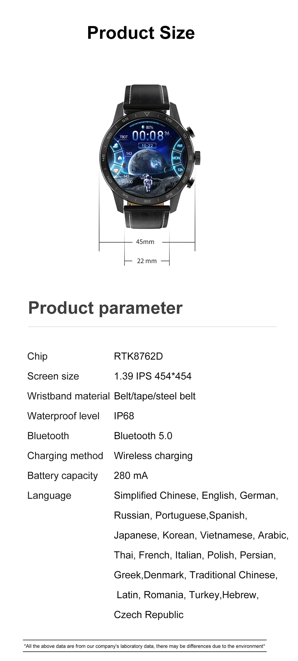 Версия Bluetooth: 4,2 + 5,0 двойной режимСовместимость ОС: Android 5,0 или выше, iOS 9,0 или вышеРежим работы: Полный сенсорный экранРазмер сенсорного экрана: 1,39 дюймов IPS цветной экран 454*454 пикселейТип зарядки: 2pin Магнитная ЗарядкаВремя зарядки: около 2 часовВремя использования: около 1 дняЕмкость аккумулятора: 280 мАч