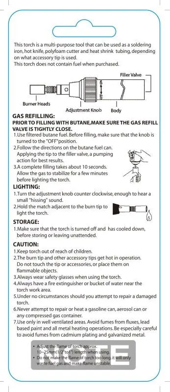Устройство поставляется без топлива этот товар не является автоматическим зажиганием, поэтому вам нужно использовать свой собственный огонь, чтобы начать его не заполнять бак с полным газом, в противном случае это вызовет огонь из-за давление, а также отверстие для выхлопа воздуха будет заблокировано