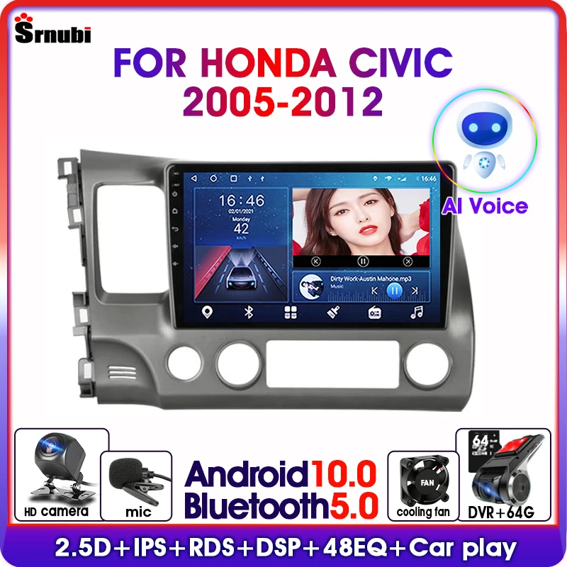 Автомагнитола на Android 10,0 с голосовым ИИ-интерфейсом для Honda Civic 8 2005-2012, радио, мультимедиа, GPS-навигация, 2 Din, MP5, DVD, 4G, Net, Wi-Fi, RDS, DSP
