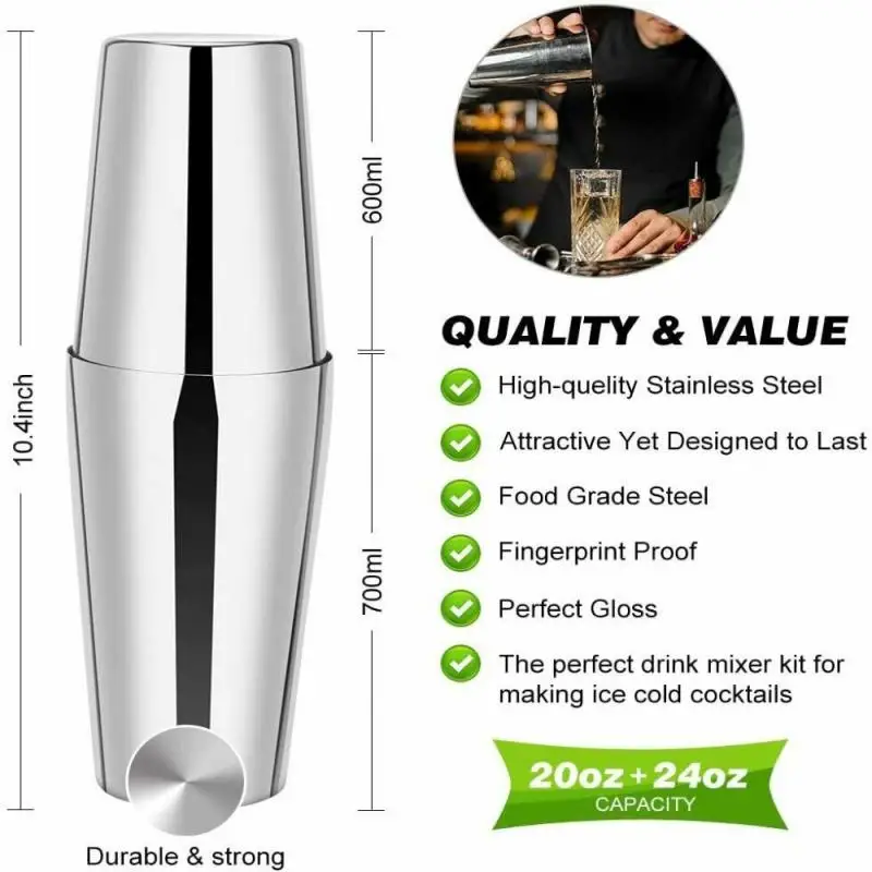【 23 шт шейкер набора 】 Бостон бармен набор, один набор для удовлетворения всех ваших потребностей барный набор инструментов. Включает в себя набор из 20oz & 24 oz Бостонский шейкер банки, 4 дозаторы, двойная мерная чашка 15/30 мл/25/50 мл, щипцы для льда, коктейлей, 2 соломинки, 2 согнутые соломинки, штопор, кисти, ложка для смешивания, 4 камни из нержавеющей стали, Рецепт коктейля, Зажим для камней, ситечко, акриловая подставка, есть эксклюзивное руководство по рецепту, которое облегчает использование для начинающих.