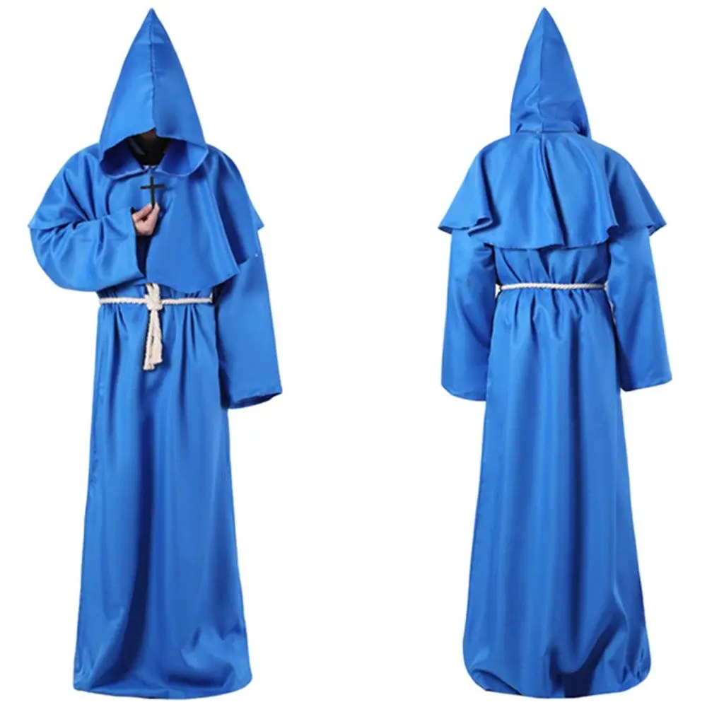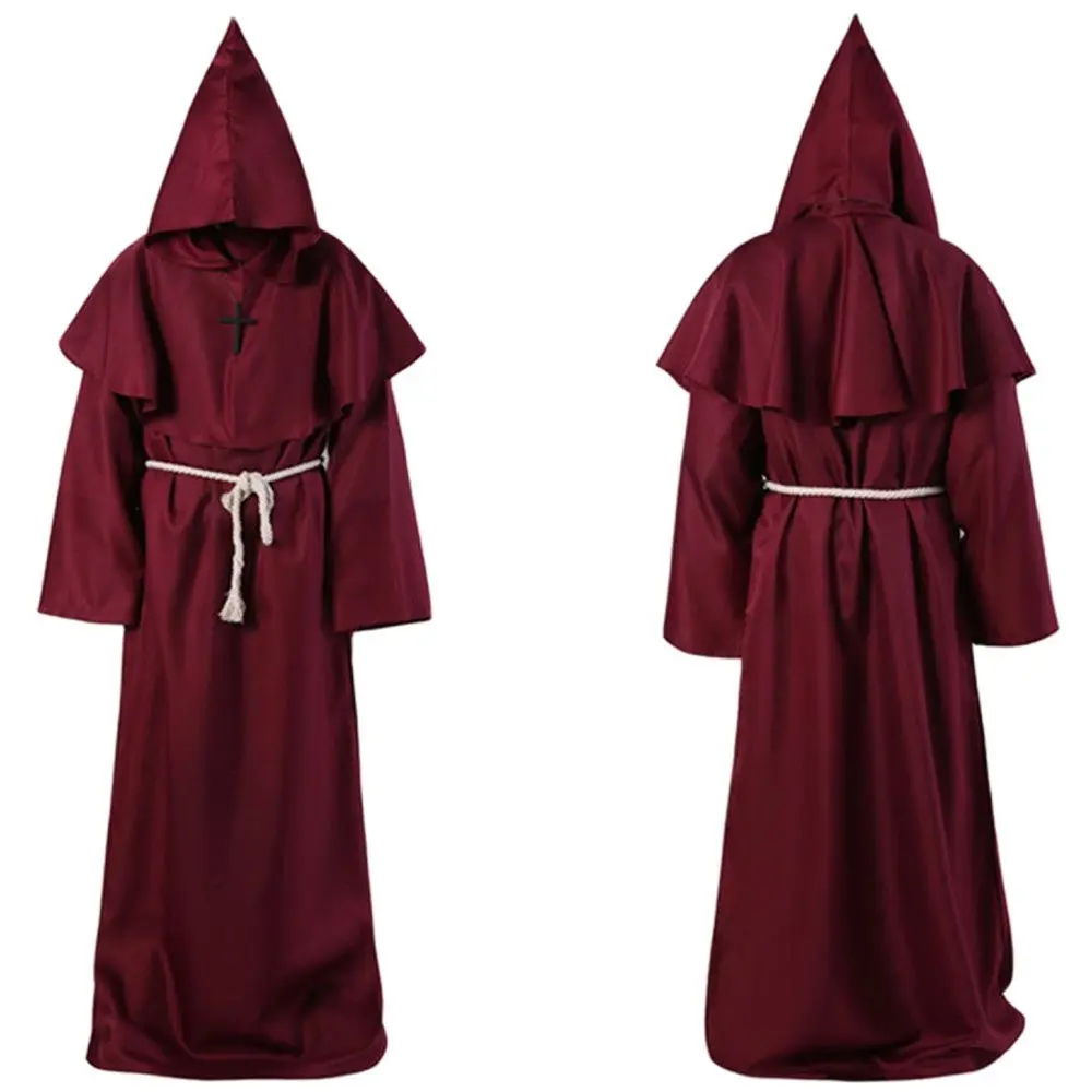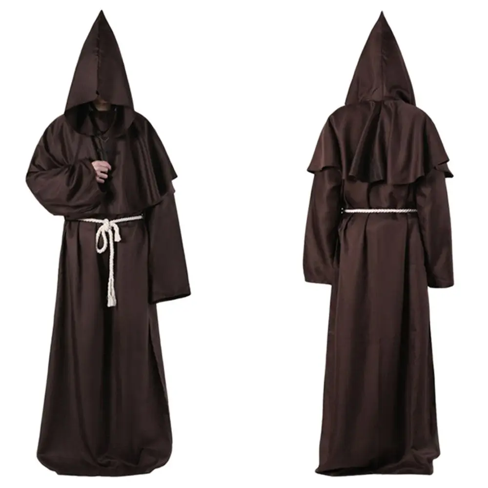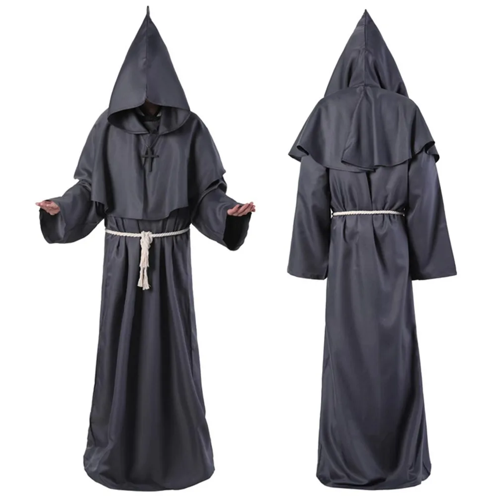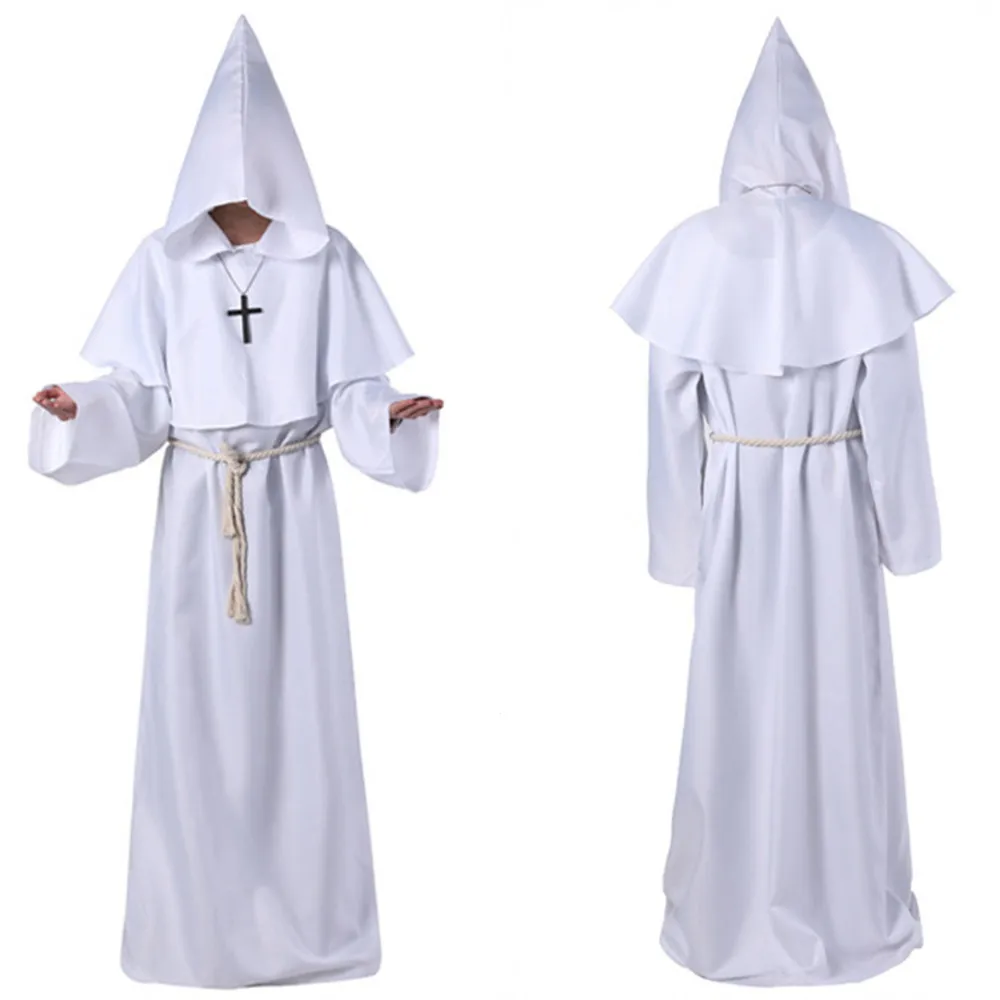Средневековый Костюм монаха на ХэллоуинНакидка для лица для загадочной атмосферы.Драпированная ткань, создающая эффект эфирного видения.Содержание товара: комбинезон-монах, пояс-шпагат, шляпа-плащ, ожерелье-крест.