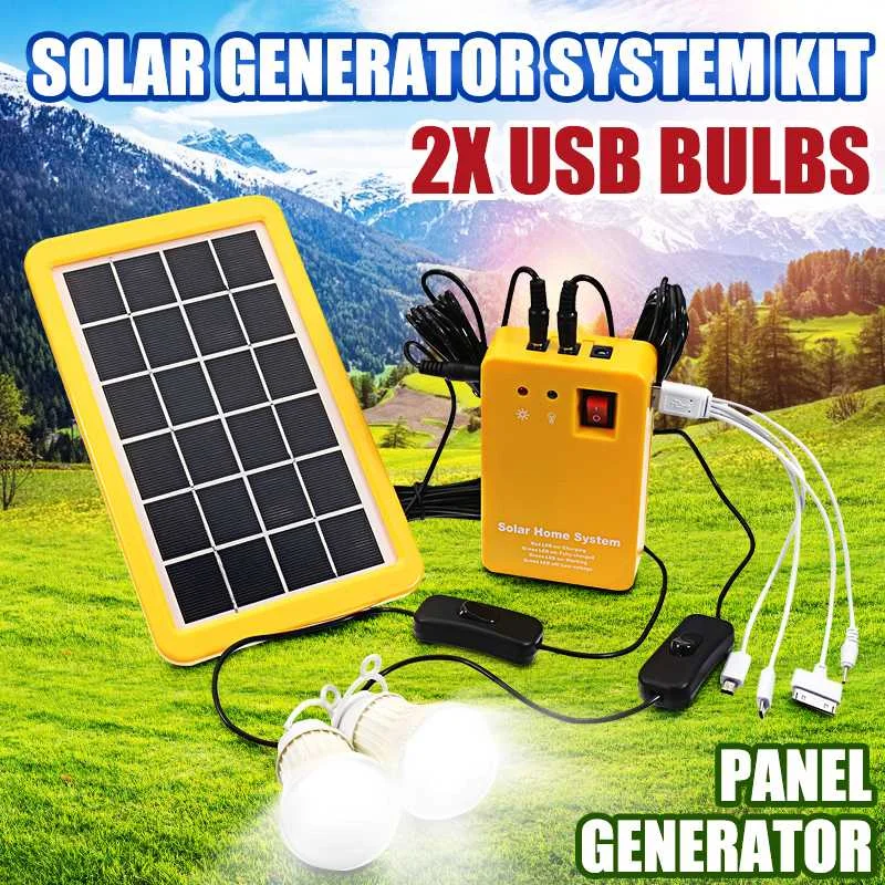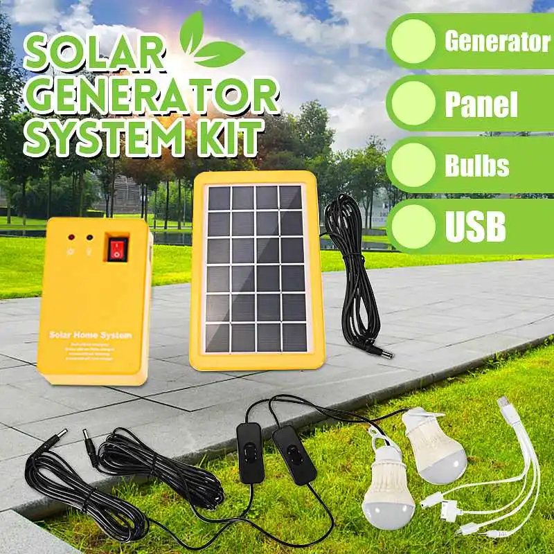 Посылка включает в себя:1X Электрический генератор1X солнечная панель2X Светодиодный светильник (с переключателем on line)1X USB кабель для зарядки (1 линия 4 головки)