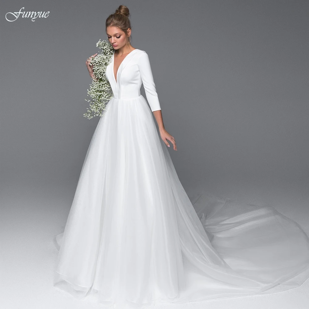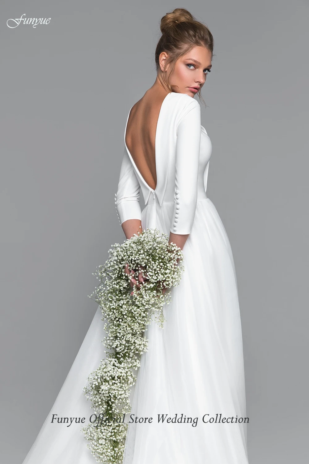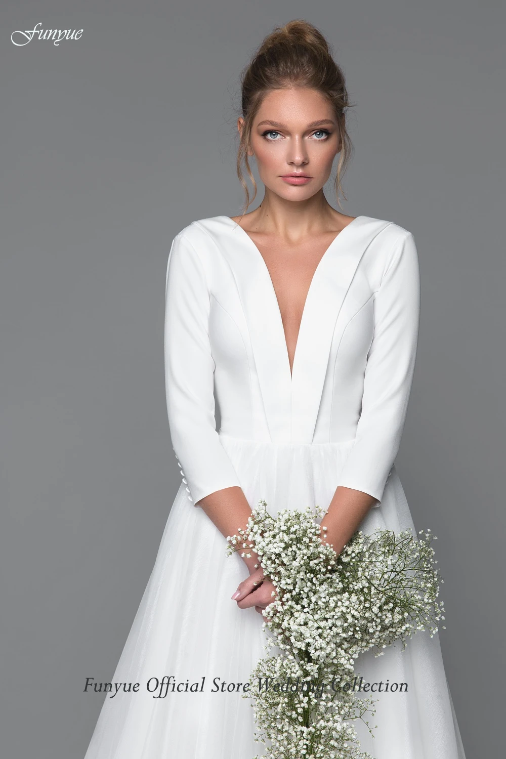 Свадебное платье Funyue, с V-образным вырезом и открытой спиной, с длинными рукавами, ТРАПЕЦИЕВИДНОЕ, из тюля, со шлейфом