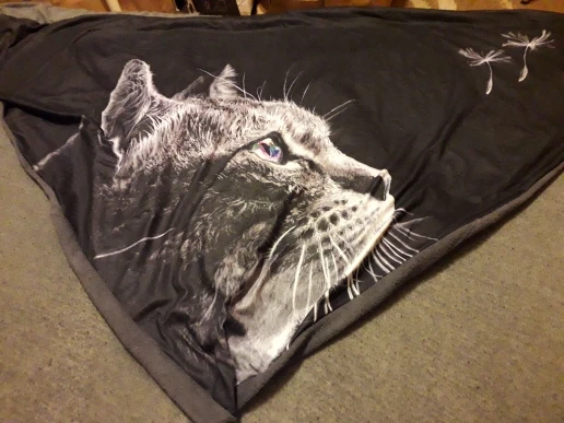 Изображение больше по объему, чем на фото, поэтому эффект немного другой, при обороте верхняя часть головы кошки перекрывается и смотрится все иначе. Обидно, но тем не менее ткань приятная, сам рисунок симпатичный, носить буду. Спасибо.