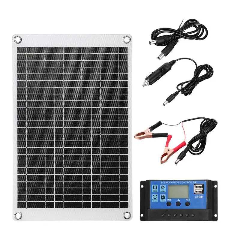 Посылка включает в себя:1 x Панель солнечных батарей1x1,5 м защищенный зажим «крокодил» провода1x1,5 м Зажигалка для сигарет1X DC линия