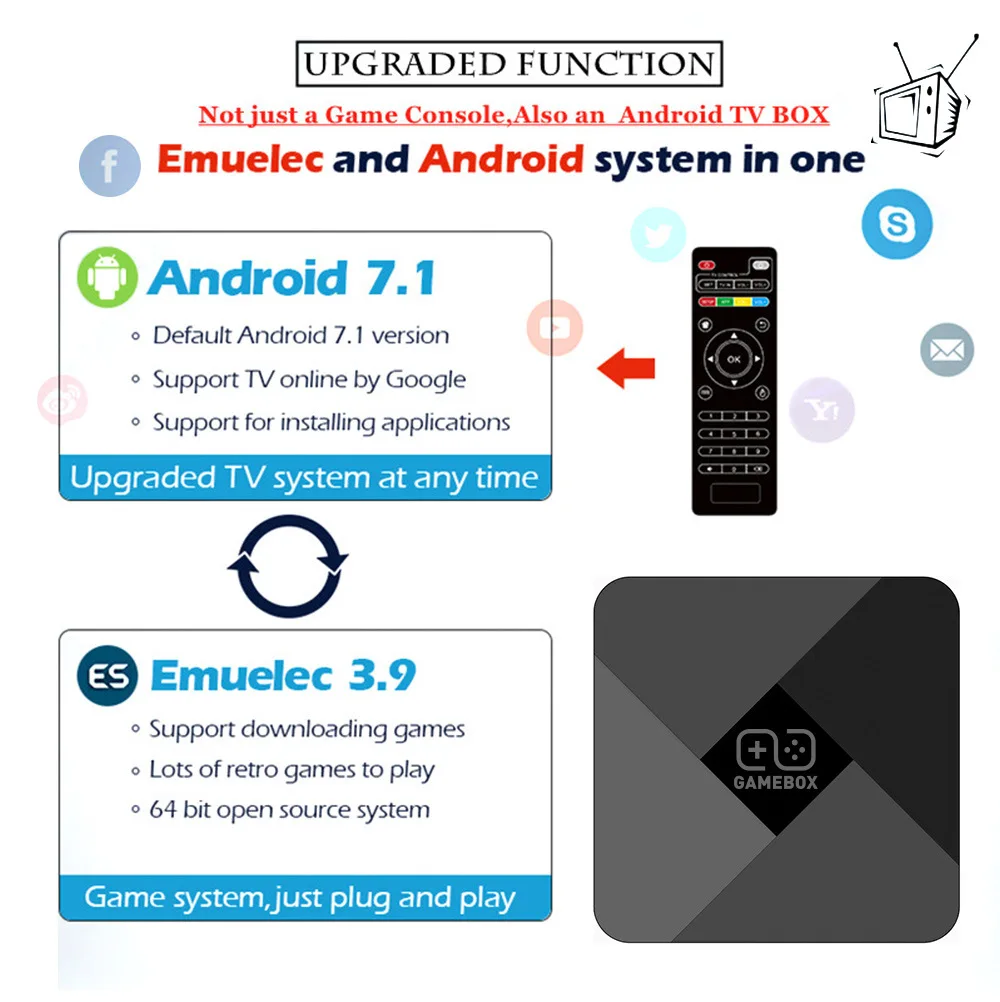 Система s:Android 7,1 (TV) и система с открытым исходным кодом-ЦП: S905L-Память: 1 Гб оперативной памяти + 8 Гб памяти-Интерфейс контроллера: проводной контроллер, беспроводной контроллер-Внешний вид: USB * 2, RJ45 * 1, HDMI-совместимый * 1, TF * 1, AV * 1, DC * 1-Количество игр: 128 г (40000 игр)-Поддержка: CPS, FC, GB, GBA, GBC, MD, SFC, FC; N64; PS1; Аркадные игры ATARI-Языки поддержки: английский-Поддержка расширения: Расширение карты TF, до 256 ГБ-Видеовыход: выход HD-Адаптер вилки: США-Размер: 10x10x1,8 см/3,93*3,93*0,7 дюйма
