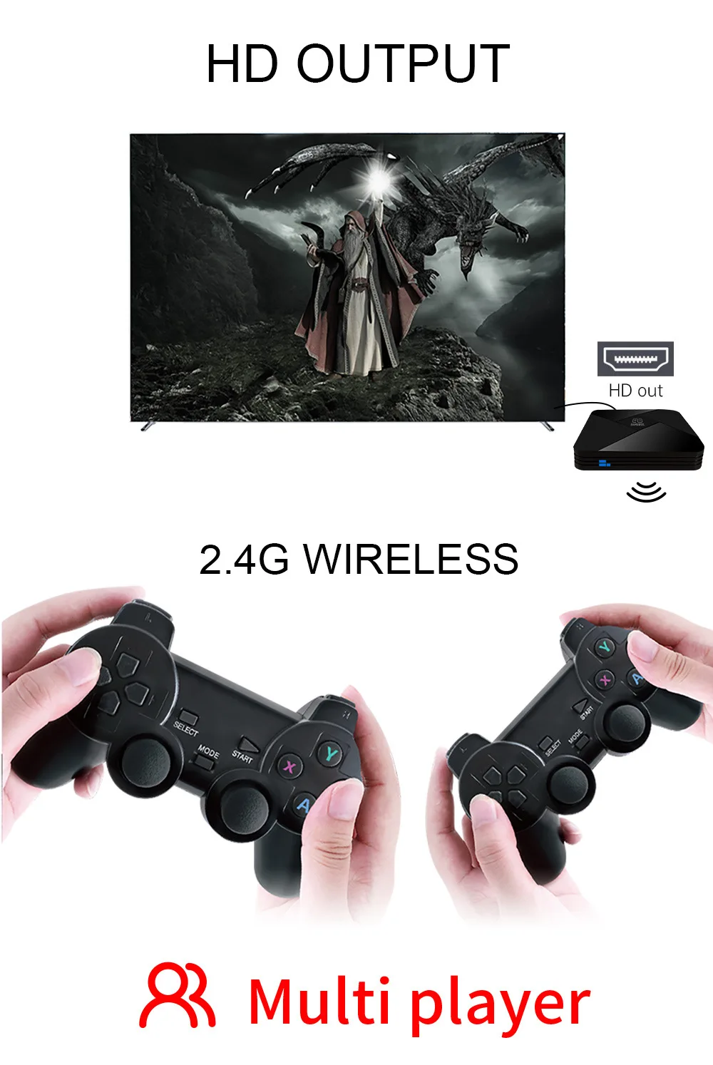 1 игровая коробка G52 геймпада Bluetooth1 * Адаптер питания1 кабель HDMI1 * пульт дистанционного управления1 * Инструкция по эксплуатации1 * карта памяти (64 ГБ или 128 ГБ, на ваш выбор)