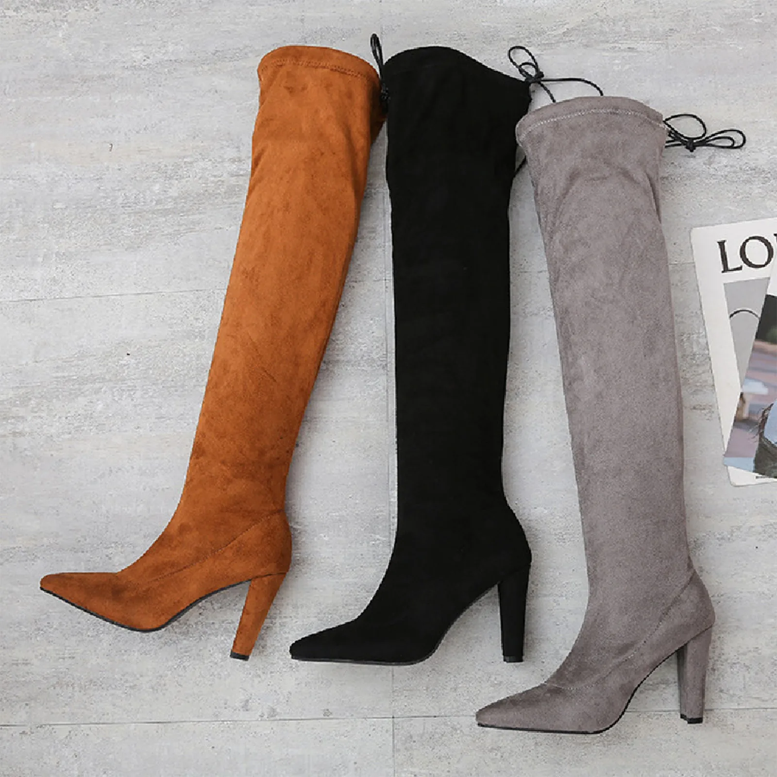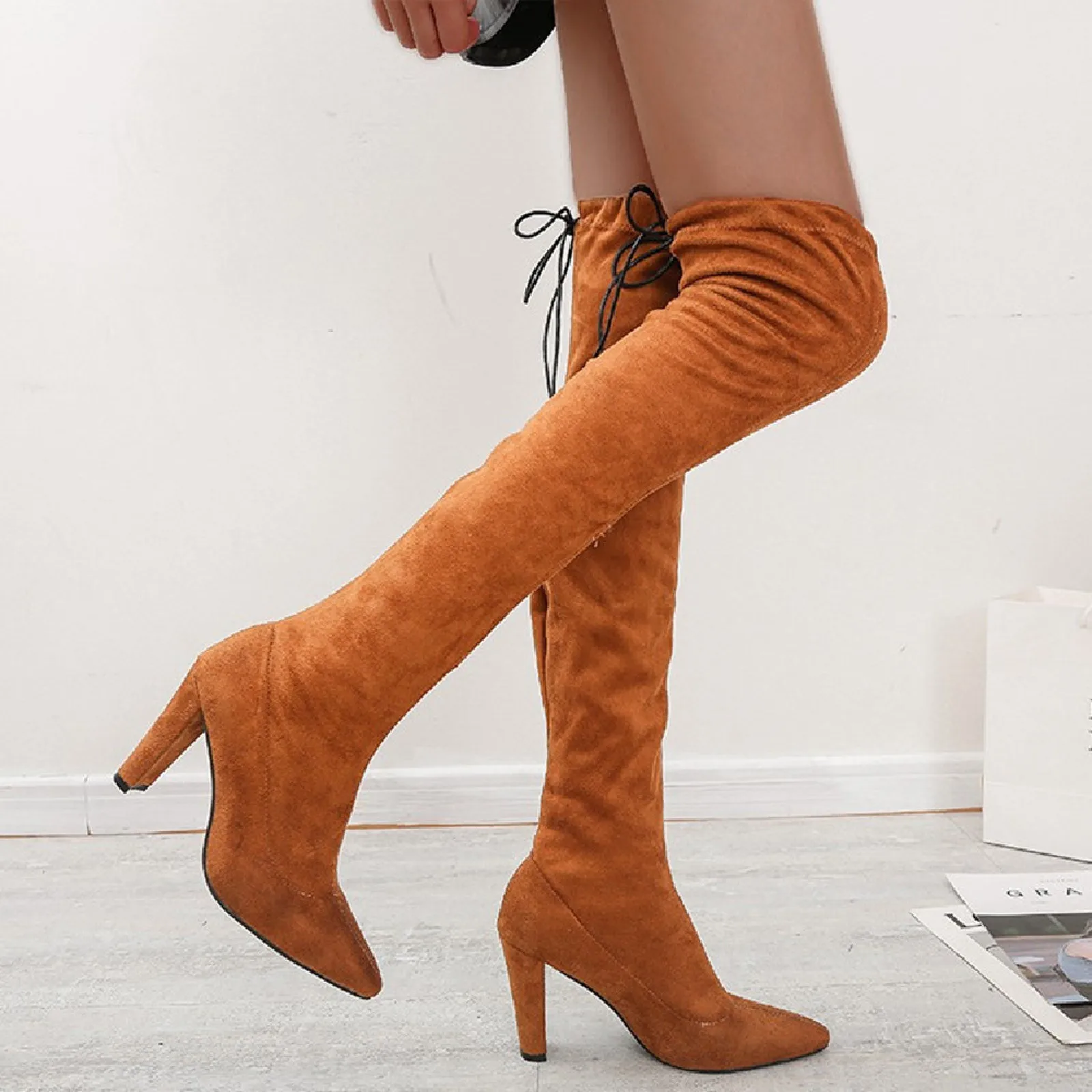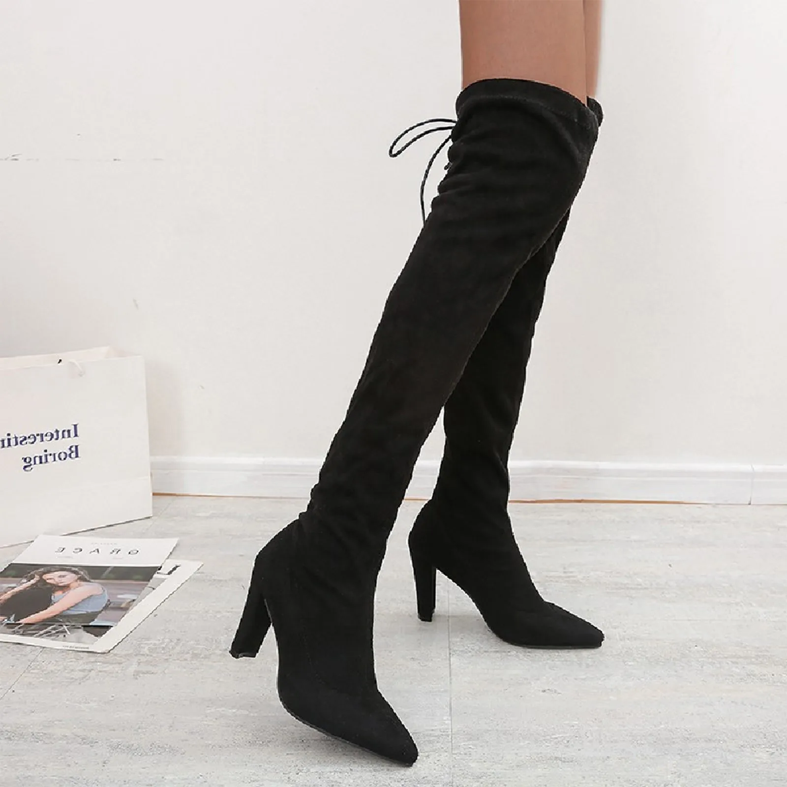 Женские замшевые ботфорты, однотонные Сапоги выше колена с острым носком, на высоком каблуке, стрейчевая обувь с завязкой сзади, для зимы и осени, 2021