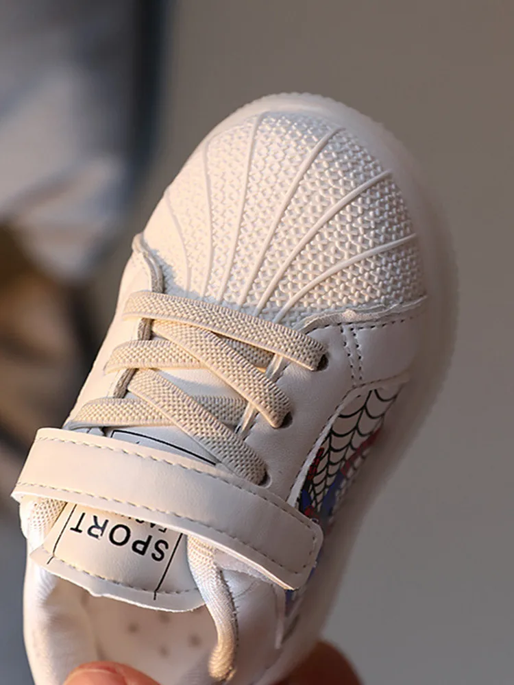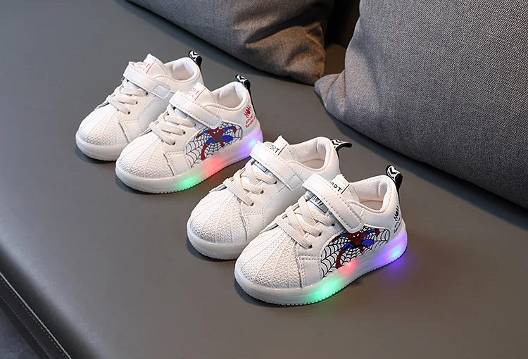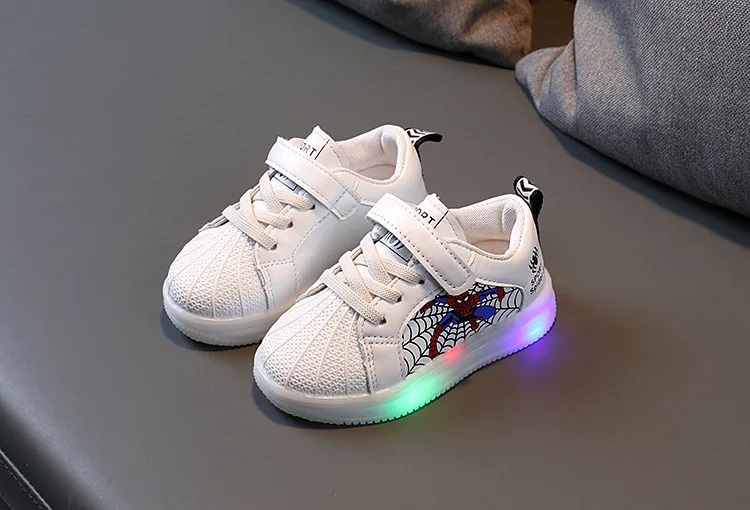 Детская повседневная обувь без застежки; С светодиодный светильник для мальчиков и девочек; Кроссовки с мультяшными принтами на весну с изображением Человека-паука светильник ed на шнуровке; Спортивная обувь; Обувь с подошвой из светящиеся ботинки