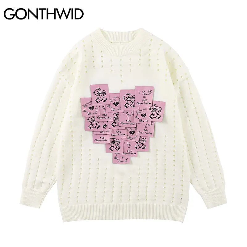 Свитер GONTHWID в стиле Харадзюку, уличная одежда, джемпер с мультяшным медведем, сердечком, стильный пэчворк, Повседневный свитер в стиле хип-хоп, вязаный Топ