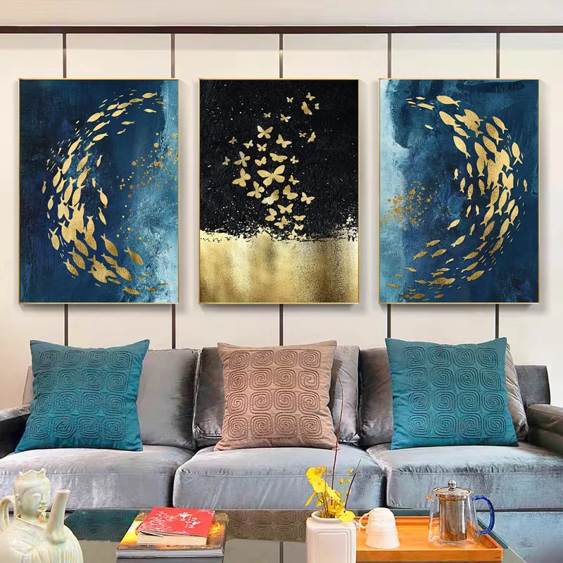 Золотая рыбка птица бабочка холст печатная Настенная картина спальня гостиная декоративная картина в нордическом стиле Триптих украшение