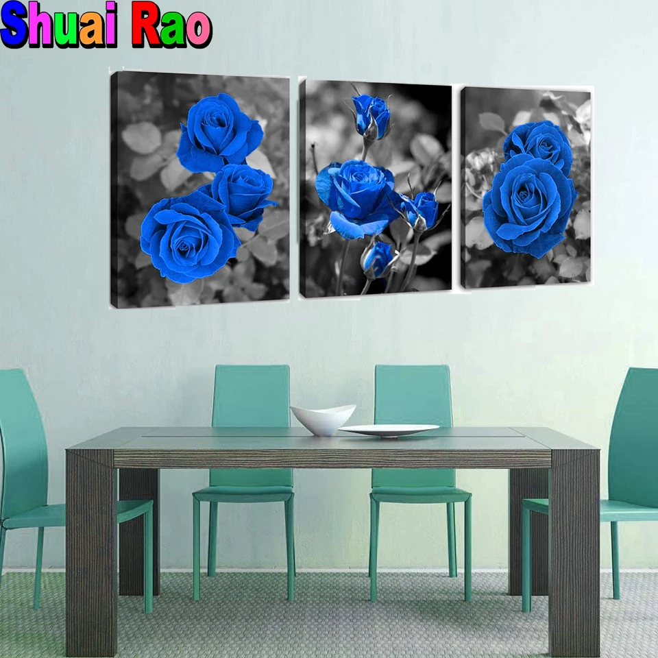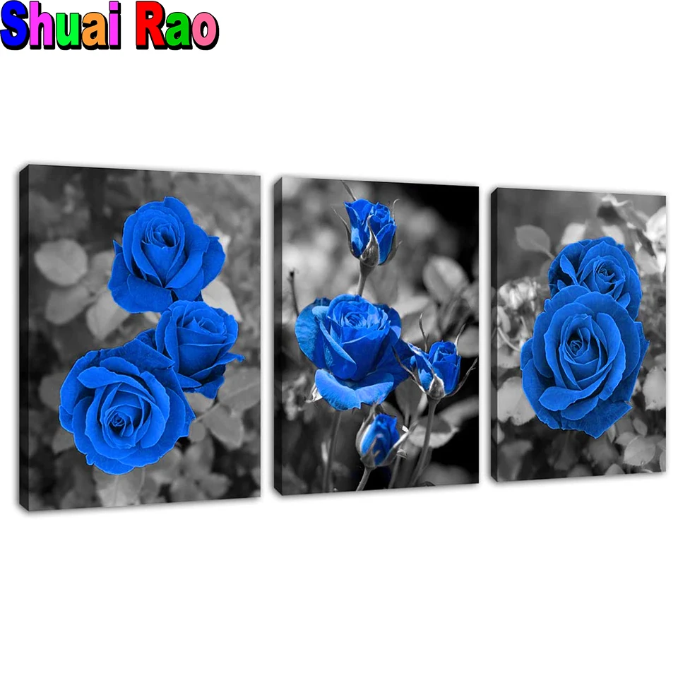 5d алмазная живопись сделай сам, синяя Роза, листья, полная квадратная, круглая, алмазная вышивка 5D, мозаика, вышивка, Триптих, домашний декор
