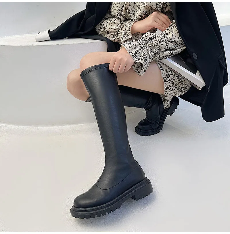 Облегающие сапоги до бедра на плоской подошве, женские сапоги до колена на платформе, черные зимние длинные мотоциклетные сапоги для женщин