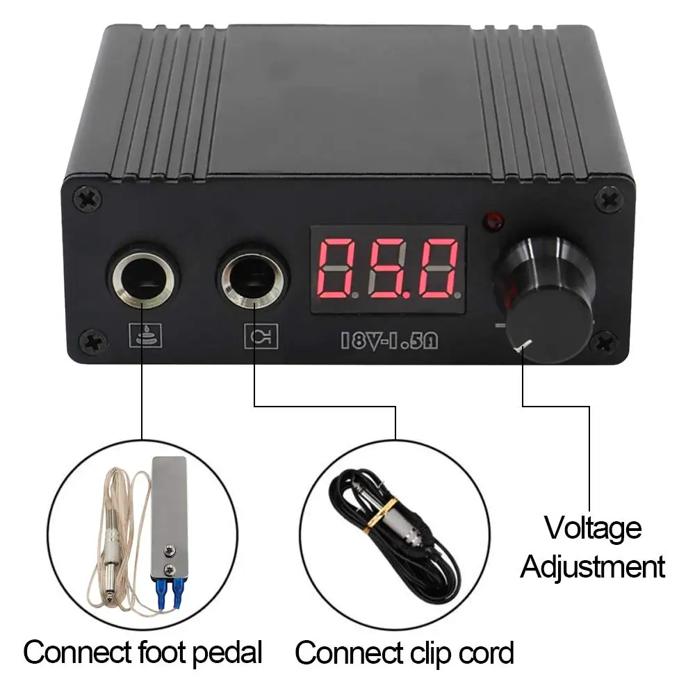 Тип: источник питания для татуВходное напряжение: 100-240Vac 50/60HzВходное напряжение диапазон: 90-264Vac 50/60HzВходной ток: 0,5 AmaxДиапазон выходного напряжения: 0-18 в постоянного тока ± 2% (можно установить по мере необходимости в пределах диапазонаВыходной ток: 1.5A (макс.)Материал корпуса: алюминийРазмер: L11.5cm * W8cm * H6cmВес нетто: 220 г