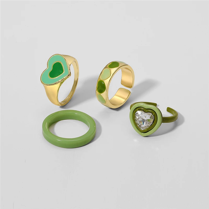 Комплект женских колец в виде сердца из смолы, с зелеными кристаллами