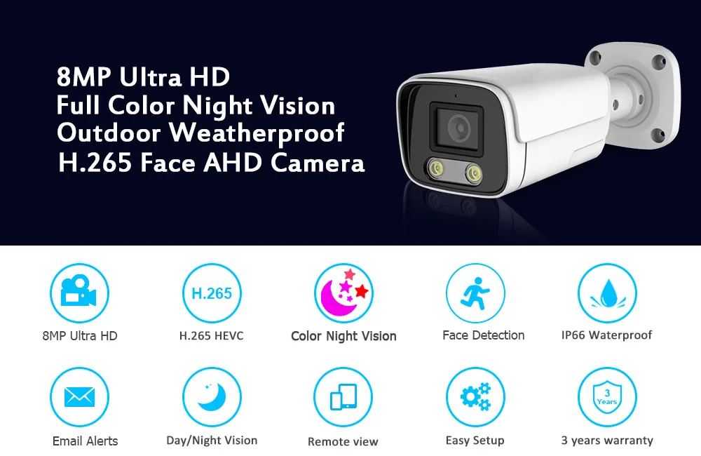 1. Ультра HD 8MP/4K дисплей высокой четкости;2. Ультра HD 8MP/4K AHD камера, металлический материал, IP66 водонепроницаемый, подходит для внутреннего и наружного использования; Пылезащитная, надежная Домашняя безопасность;3. Улучшенное H.265 Сжатие видео, подключи и работай, простота установки;4. Поддержка полноцветного дневного ночного видения;5. Поддержка распознавания лица, записи лица, воспроизведения лица, обеспечивает ультра высокое разрешение видео наблюдения, обеспечивая максимальную детализацию и четкость доступны;6. Поддержка ночного видения Ultra HD, расстояние передачи составляет 500 метров;7. Поддержка IR-CUT переключателя двойного фильтра, днем и ночью для достижения мониторинга, цвет не является частичным искажением цвета;8. Поддержка обнаружения движения, оповещения по электронной почте, воспроизведения видео;9. Поддержка Android,Iphone,Ipad, ПК, P2P просмотра;10. Удаленный доступ в любом месте, в любое время;11. Подходит для всех видов мест применения;