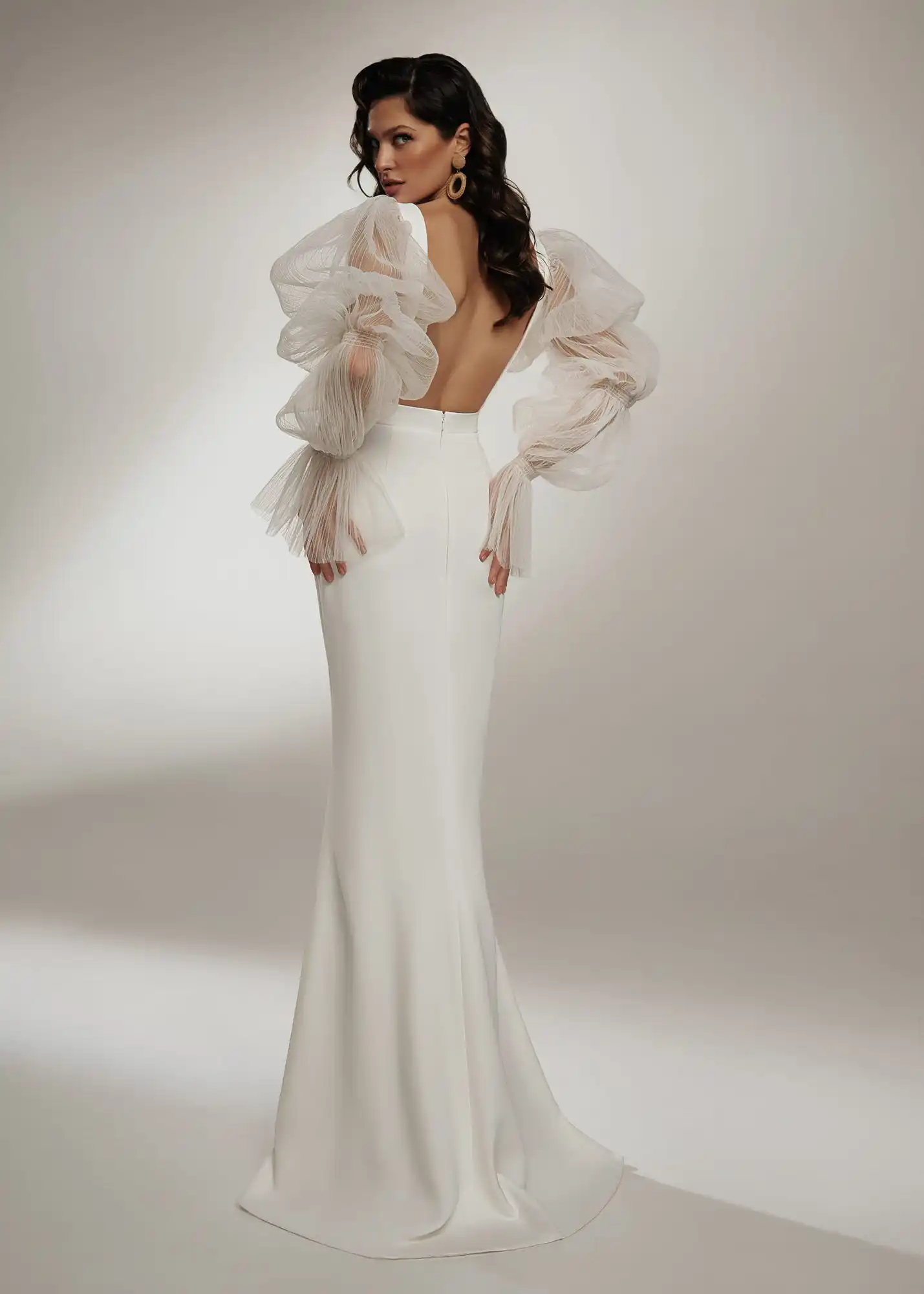 Платье свадебное атласное с открытой спиной, длинным рукавом и откр...