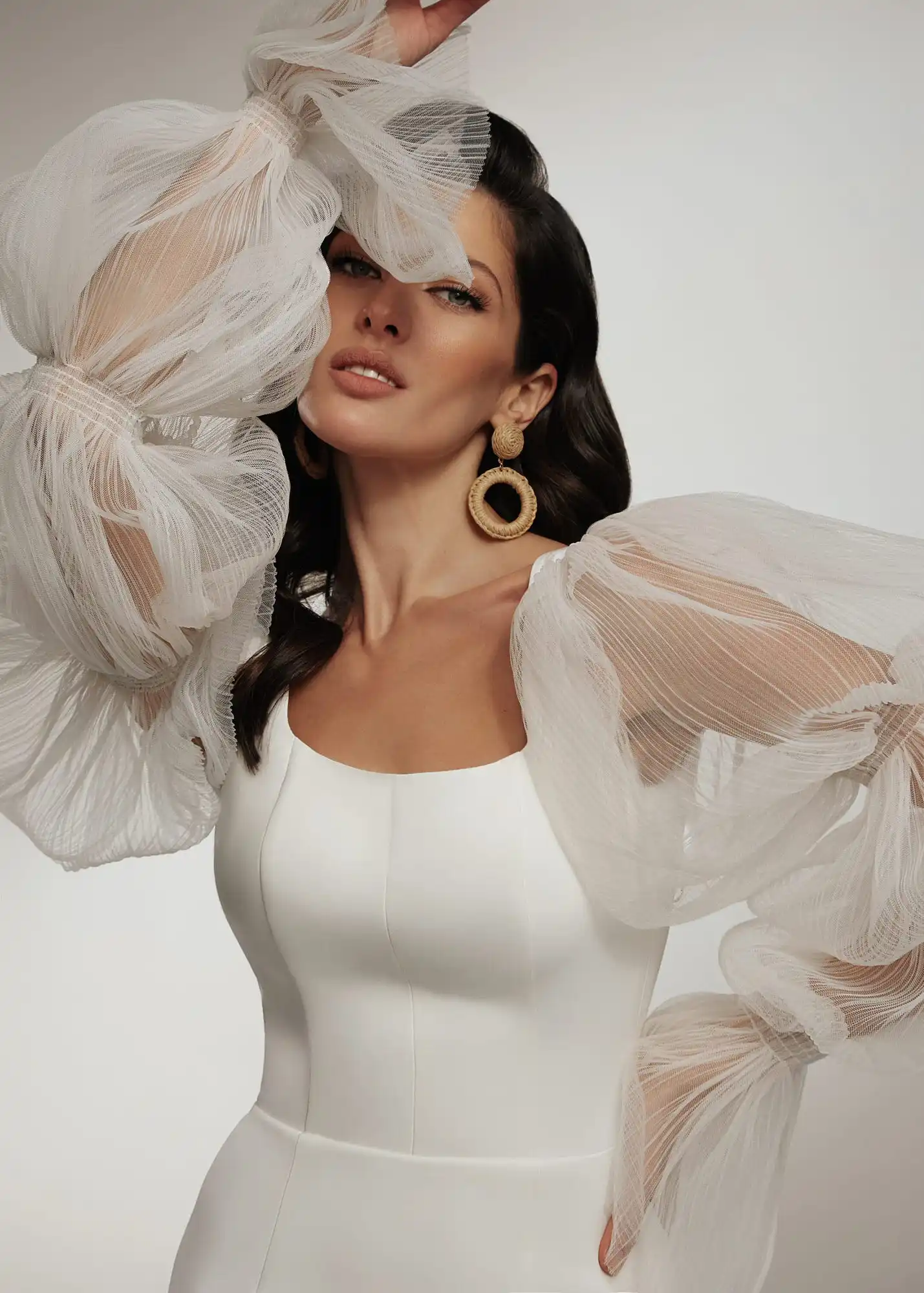 Платье Свадебное ТРАПЕЦИЕВИДНОЕ из тюля с длинными рукавами-фонарик...