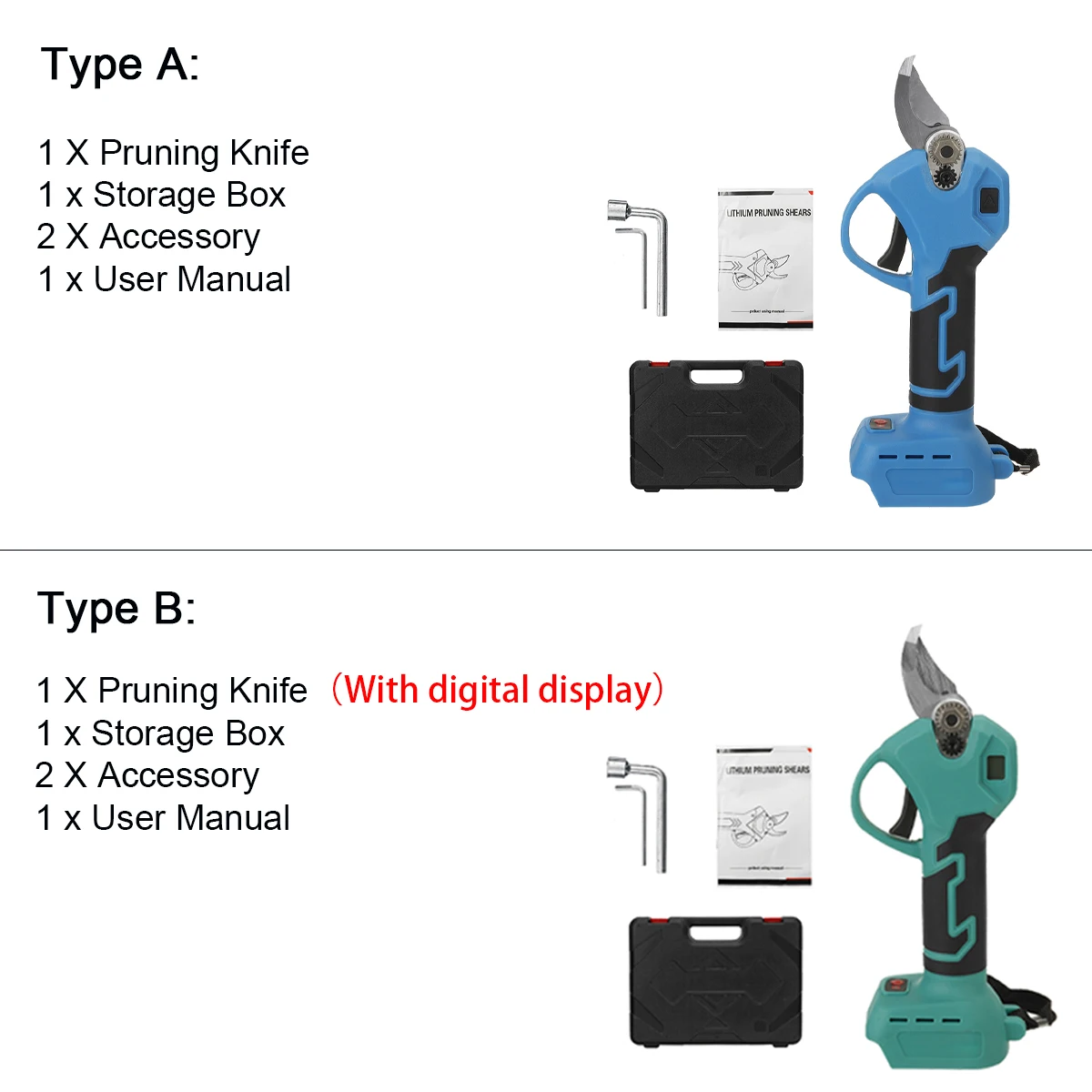 Посылка входит:Тип А:1 х нож для обрезки1 х ящик для хранения2 X аксессуары1 х Руководство пользователяТип B:1 х нож для обрезки (с цифровым дисплеем)1 х ящик для хранения2 X аксессуары1 х Руководство пользователяСпецификация:Название продукта: электрические секаторыЦвет: зеленый/синийШтекер: штекер MaedaМаксимальный диаметр резки: 30 ммОсобенность:-Низкий уровень шума, хорошая устойчивость к усталости.-Прост и удобен в использовании, что в 8-10 раз превышает эффективность традиционной ручной обрезки.-Производительность стабильна, качество обрезки соответствует требованиям цветоводства, практически нет утечки ножниц.-Беспроводные перезаряжаемые секаторы для резки и обрезки веток в фруктовых садах, виноградниках.-Прочное Лезвие из вольфрамовой стали.-Эргономичная и удобная ручка.-Гибкий в использовании, легко поворачивается, безопасный и надежный, простой в обслуживании, удобный для замены аккумулятора и эксплуатации.-Качество обрезки может соответствовать требованиям садоводства.Примечание:-Возможны небольшие погрешности из-за ручного измерения.-Цвет может отличаться от цвета на дисплее, надеемся на понимание.