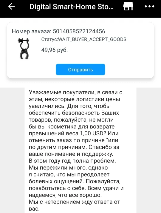 Продавец не ощущал товар и писал, поэтому для доставки требуется больше денег: ( Но хорошо, что он вернет деньги обратно.