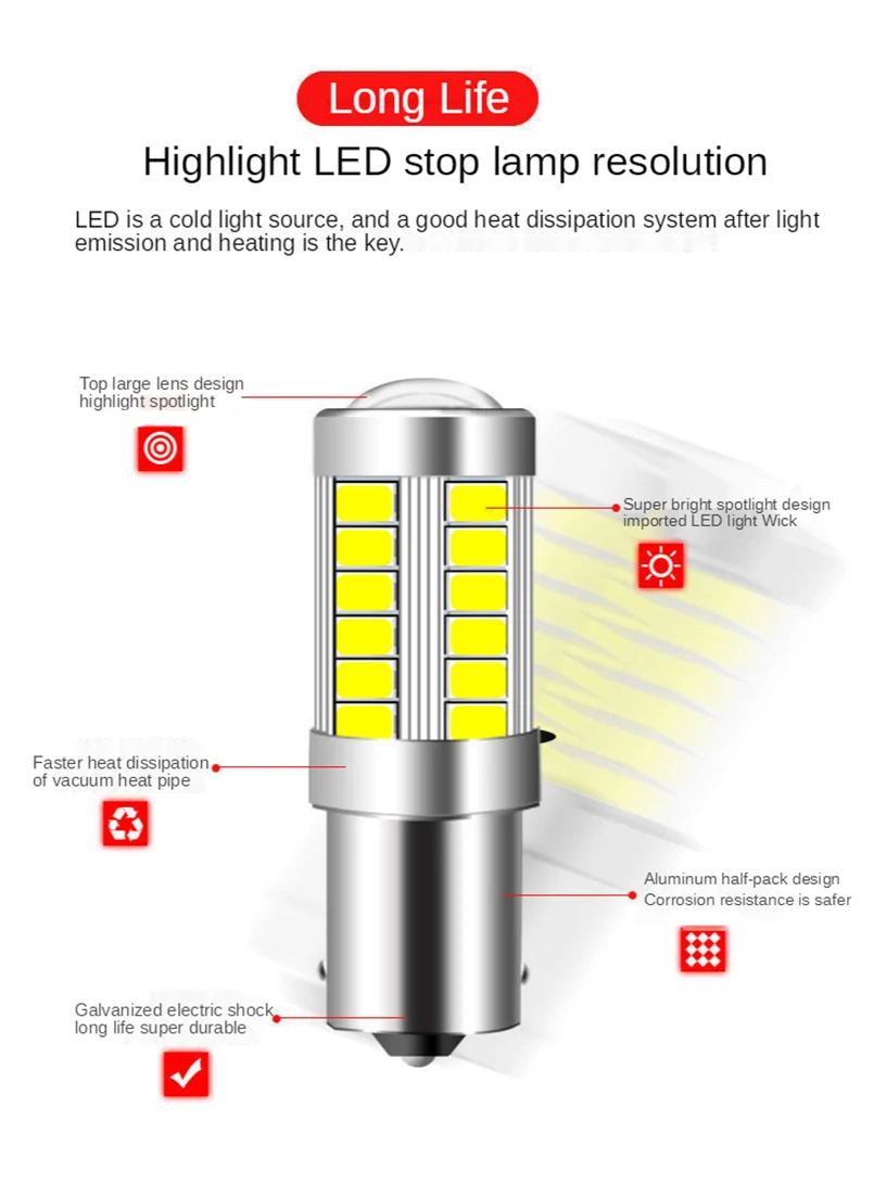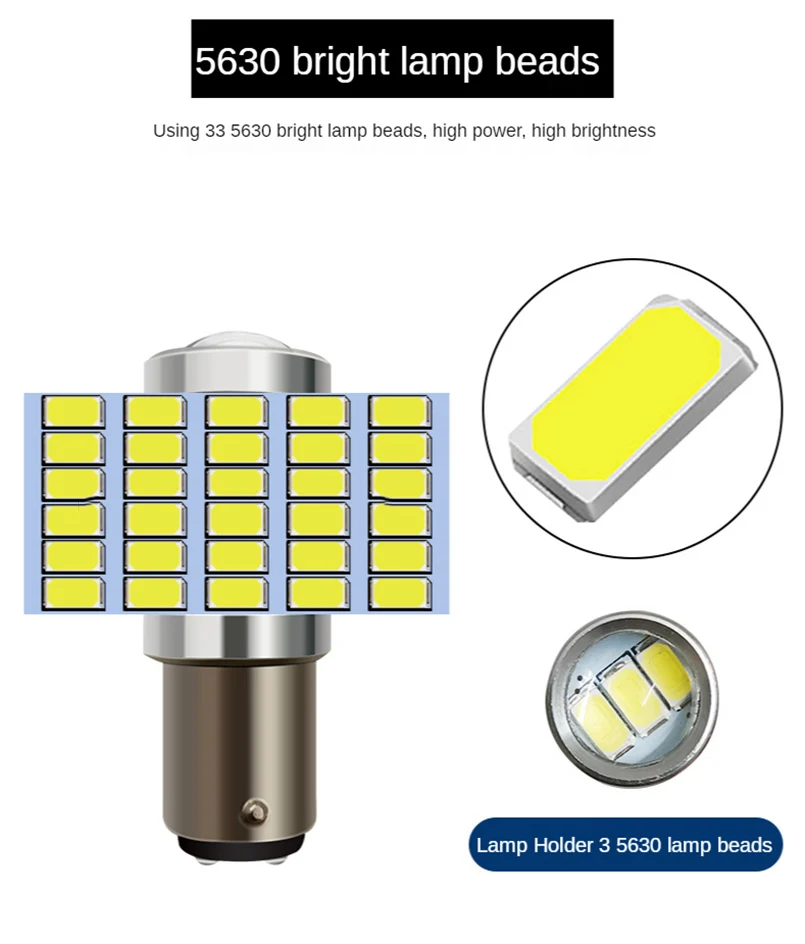 1. Характеристики: Canbus, без ошибок, без ошибок2. Цвет: 6000K ксеноновый белый3. Световой поток: 800 лм4. Водонепроницаемость: IP655. Напряжение: 12 В постоянного тока6. Тип разъема: 1156 P21W BA15S8. Номинальная мощность: 5 Вт9. Светодиодный номер: 33SMD 5630 чипы10. Срок службы: 50000 часов