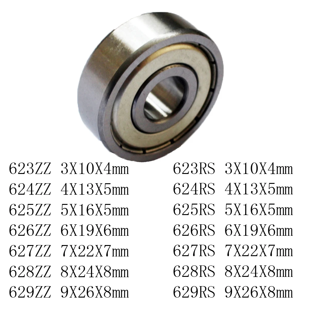 623 3x10x4 мм 624 4x13x5 мм 625 5x16x5 мм 626 6x19x6 мм 627 7x22x7 мм 628 8x24x8 мм 629 9x26x8 мм ZZ подшипник шариковый RS