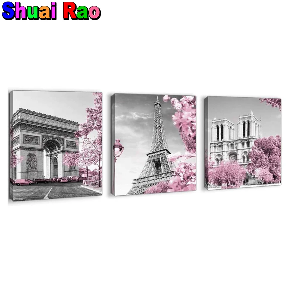 Триптих, полностью алмазная живопись, Парижская башня, розовый цветок, городское строительство, вышивка, полноформатная Алмазная мозаика, Набор для творчества, 3 шт. в наборе