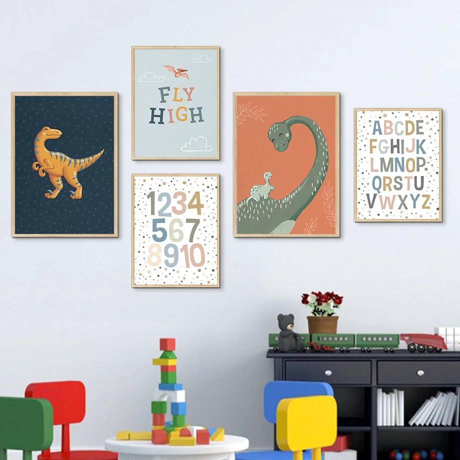 Картина на холсте с изображением динозавра, алфавита, животных
