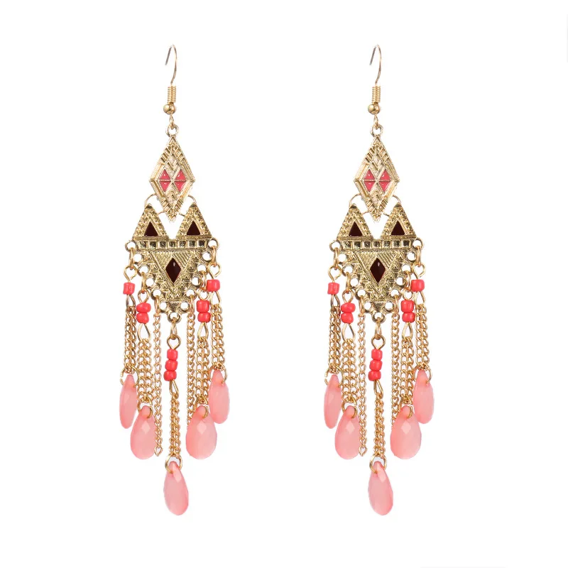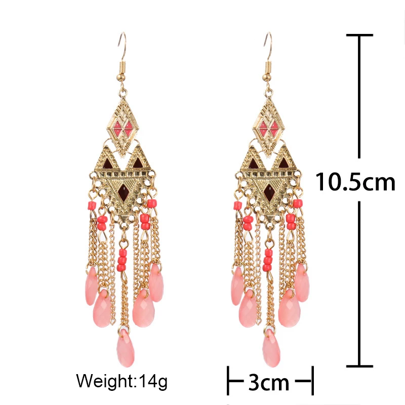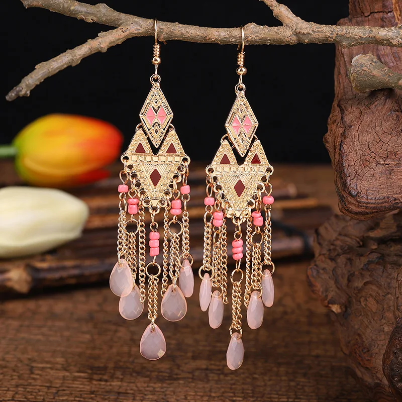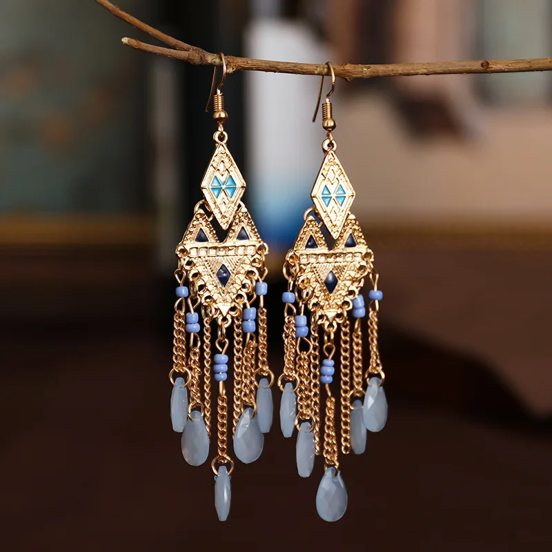 Винтажные богемные синие хрустальные Висячие серьги для женщин, этнические длинные Красочные Зеркальные золотые цепи, бусины в виде риса ювелирные изделия