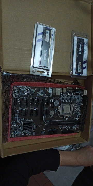 Набор пришел, в отличном состоянии мат.плата, процессор б/у снизу пришлось чистить от белого чего-то, райзеры новые, все работает и запустилось на 8 картах с первого раза.