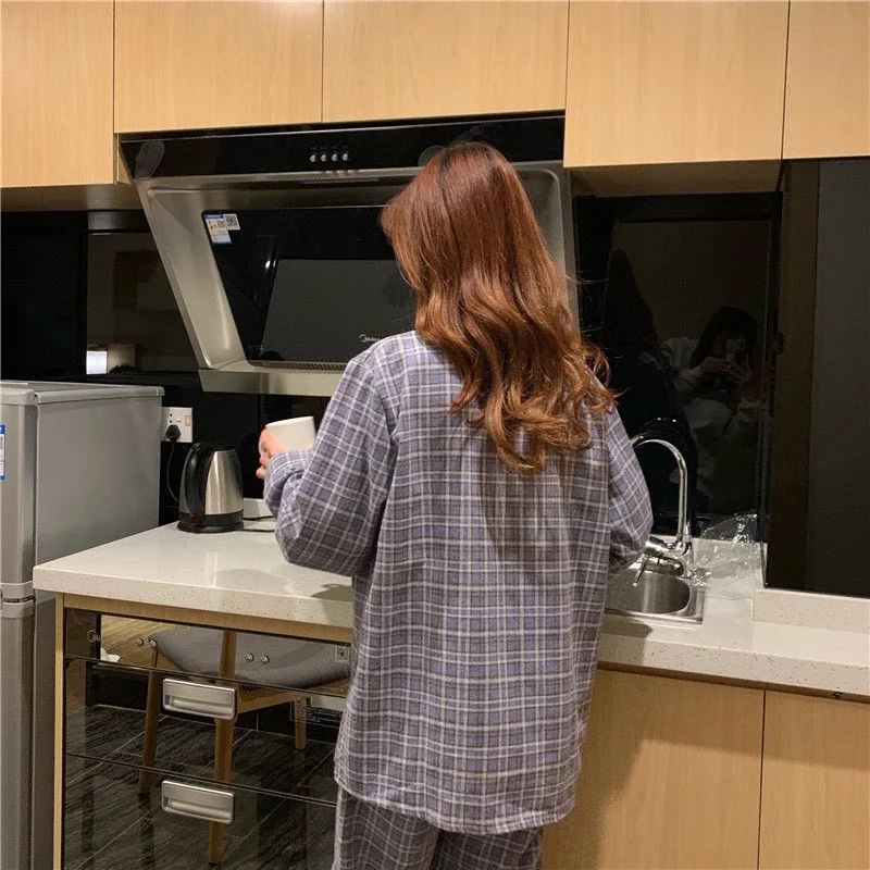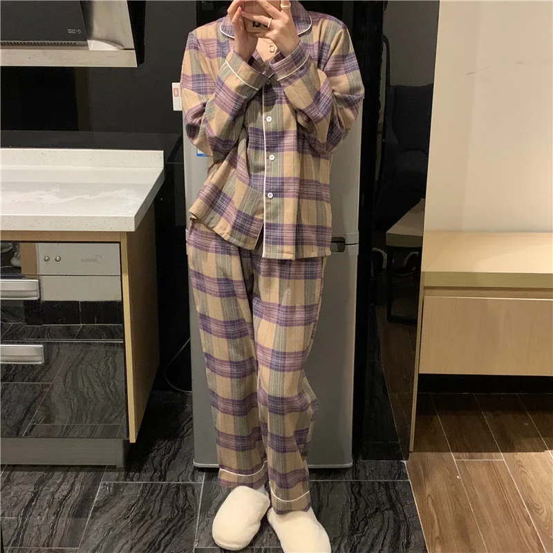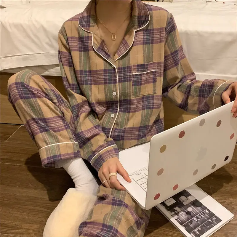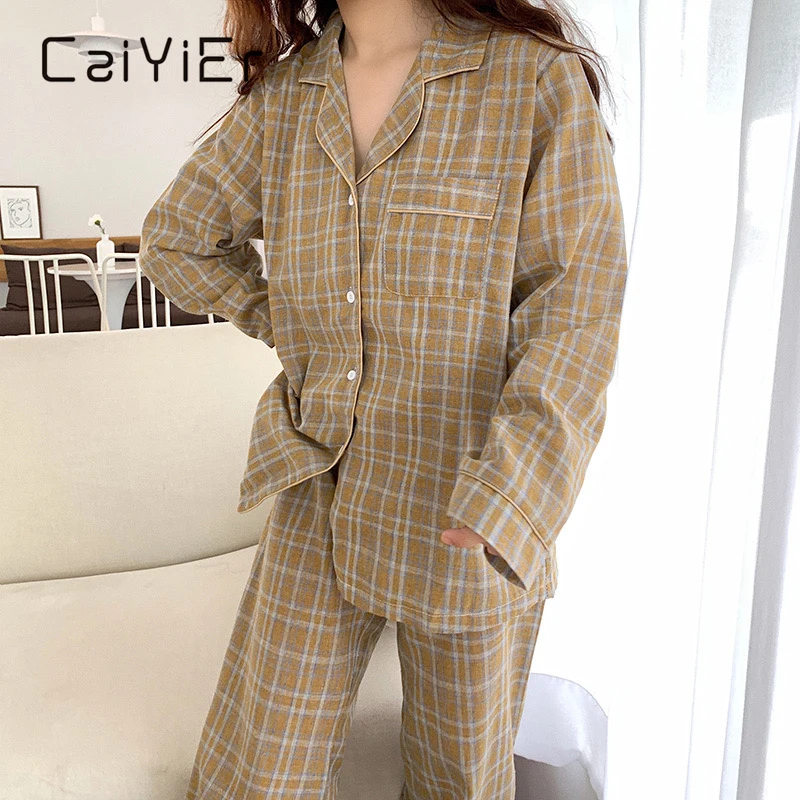 Женский Пижамный костюм CAIYIER, свободная пижама в клетку с длинным рукавом и отложным воротником, в Корейском стиле, Осень-зима