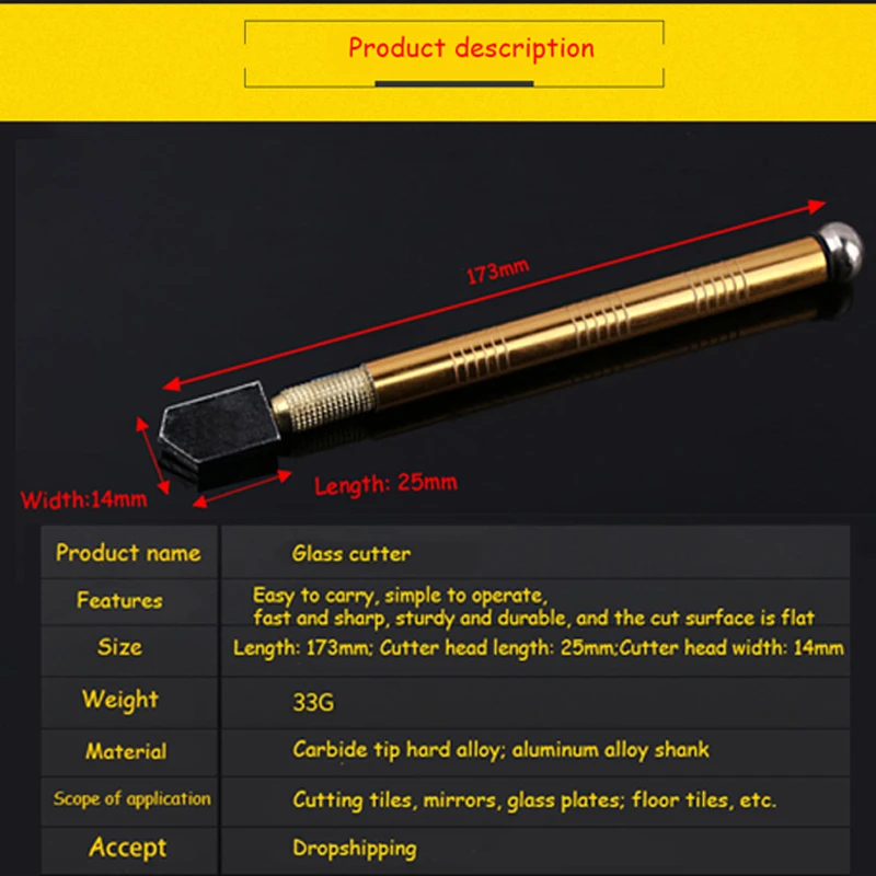 Режущая головка из сплава для стеклаПрименение: резка стеклянных пластин, зеркал, напольной плитки, керамической плитки и других материалов.Идеальный инструмент для работы дома и резки.Материал: режущая головка из сплаваРазмер: около 175 ммДиапазон резки: толстое стекло 5-12 мм