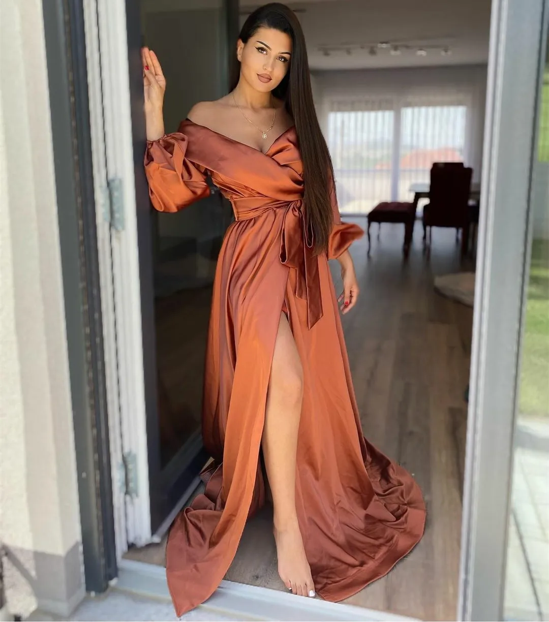 Атласные оранжевые вечерние платья с длинным рукавом, с разрезом, на молнии сзади, плиссированные халаты, свадебные вечерние платья для женщин