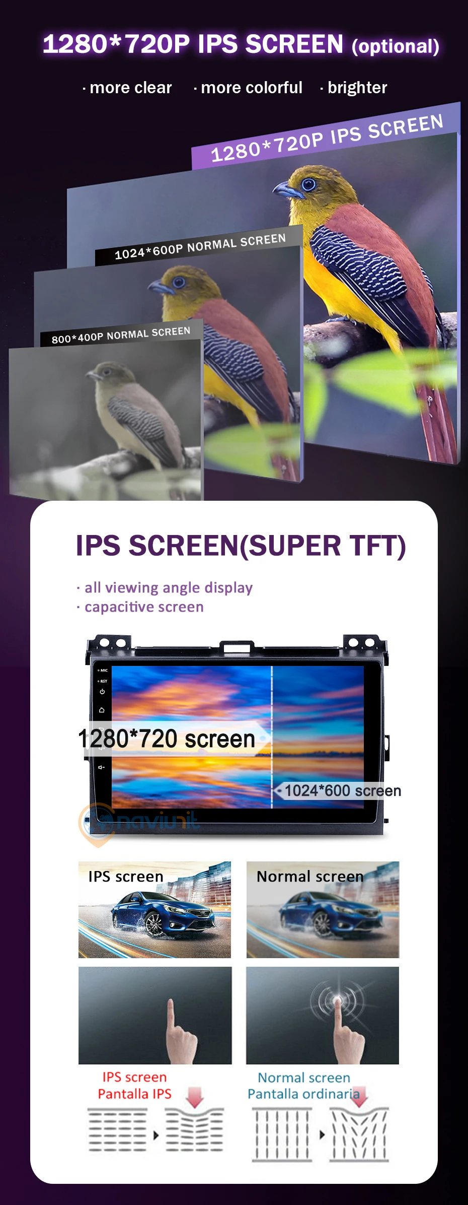 Экран 1280*720P IPSЭто Радио имеет два вида экрана-1024*600P HD экран и 1280*720P супер HD экран. Экран 1280*720 ярче и ярче обычного hd-экрана. Вы можете выбрать тип по вашему желанию.