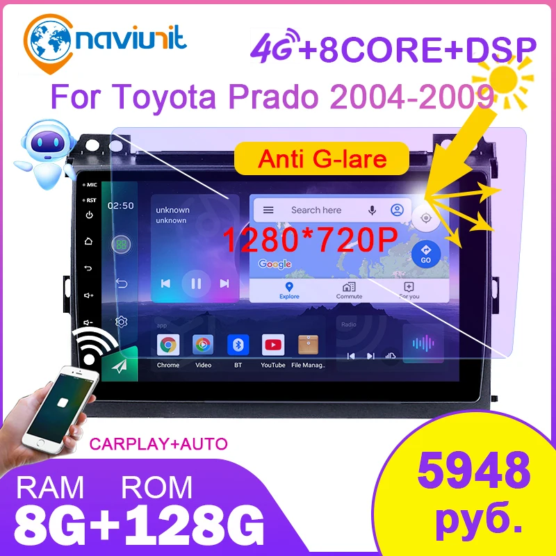 Naviunit магнитола 2 din android 10 с экраном автомагнитола для Toyota Land Cruiser Prado 120 2003-2009 Carplay, интеллектуальная система, Авторадио видеоплееры Мультимедиа блютуз автозвук Навигация стерео Навигатор