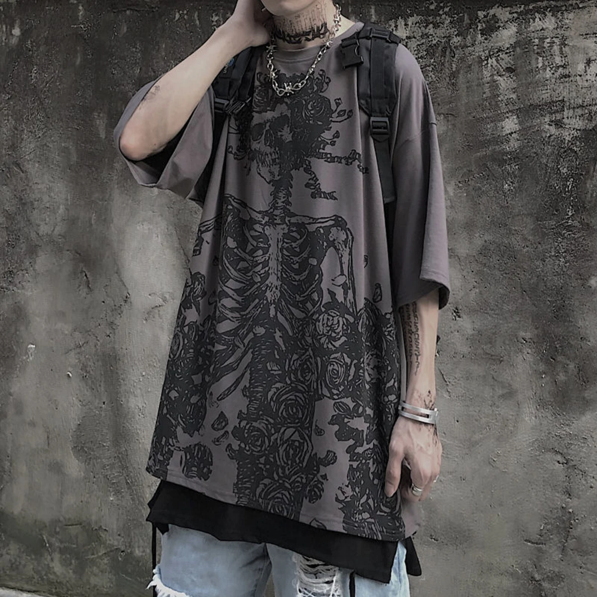 Футболка мужская с принтом в виде черепа розы, Готическая модная тенниска оверсайз с графическим принтом, в стиле хип-хоп, свободная майка на Хэллоуин