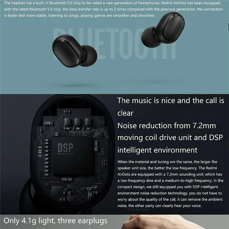 Примечание:1. Если вы покупаете два или более, вы получите дополнительную скидку 2%!2. Из-за длительной транспортировки мощность гарнитуры может быть истощена. После получения посылка, пожалуйста, сначала зарядите гарнитуру. Затем используйте, спасибо за понимание.После продажи:Если количество обнаружено несовместимым с количеством после получения экспресс-доставки или проблемы с качеством, пожалуйста, не открывайте споры по желанию, И свяжитесь с нашим послепродажным обслуживанием клиентов, чтобы решить вовремя, спасибо за вашу поддержку и понимание!Redmi AirDots 2:Настоящая Беспроводная bluetooth-гарнитура, bluetooth 5,0, автоматически подключаетсяБыстрое подключениеАвтоматическое подключение секунд, можно использовать с наушниками1 и 2 переключателя ---- (Новый)Один или два режима ушей бесшовный сдвиг.Bluetooth 5,0Новое поколение технологии Bluetooth для более быстрых и стабильных соединенийСветильник 4,1gУдобно носить, свободно регулируется, не легко отпадает12h длительный срок службы батареиС зарядным боксом, кистью 6 фильмовГолосовое управлениеКак сбросить гарнитуру:1. Удерживайте многофункциональную клавишу в течение 15 секунд, пока красные и белые огни не мигают поочередно 3 раза и не выйдут, устройство успешно сбрасывается;2. Игнорируйте или удаляйте Redmi AirDots S в списке устройств Bluetooth телефона, удалите запись подключения и завершите сброс.Упаковочный лист:1 * bluetooth-гарнитура (L)1 * bluetooth-гарнитура (R)1 * зарядное устройство1 * Руководство пользователя