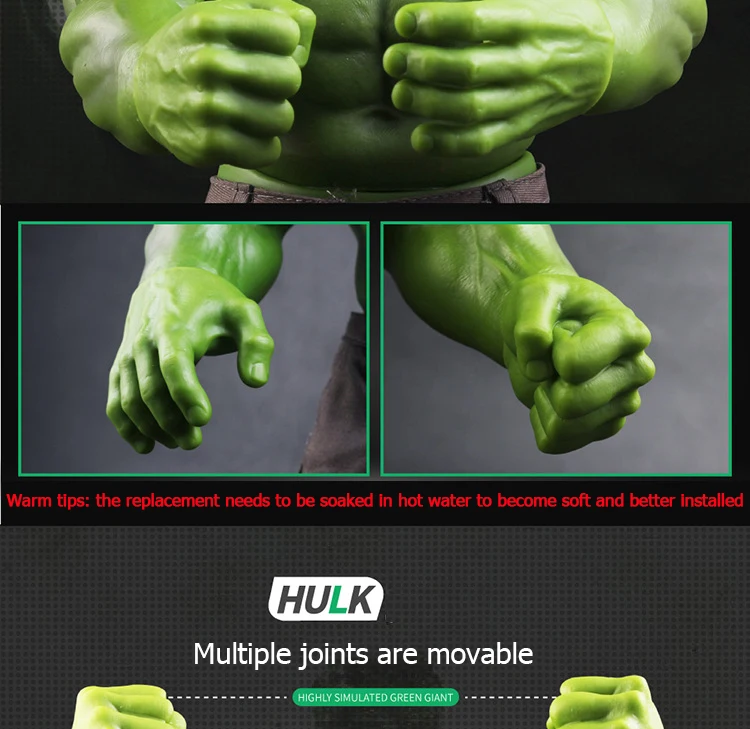 Название продукта: Модель ХалкаМатериал изделия: эмальРазмер изделия: 42,5 см или 30 смАксессуары продукта: Халк x1, ладонь x 2, кулак x 2, брюки x1Теплые советы: при смене аксессуаров необходимо замачивать в горячей воде, чтобы сделать ее мягкой и легкой в установке