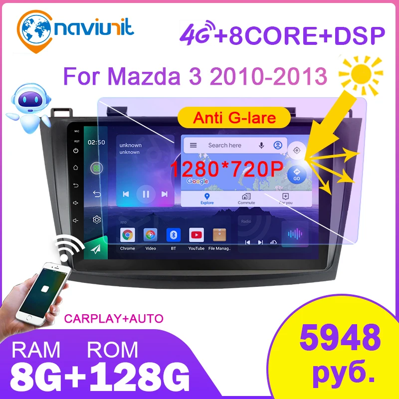 Naviunit автомагнитола 2дин андройд 10 с экраном магнитола, мультимедийная аудиосистема для Mazda 3 2010-2013 с Carplay, интеллектуальной системой, видеоплеерами, стерео bluetooth-динамик 2DIN IPS магнитофон в машину