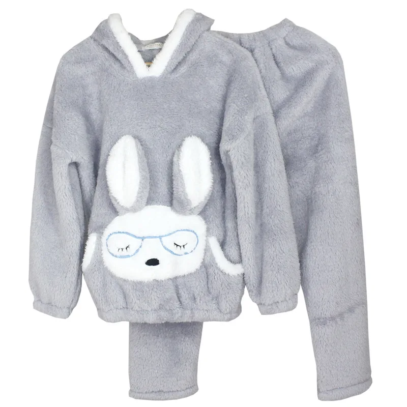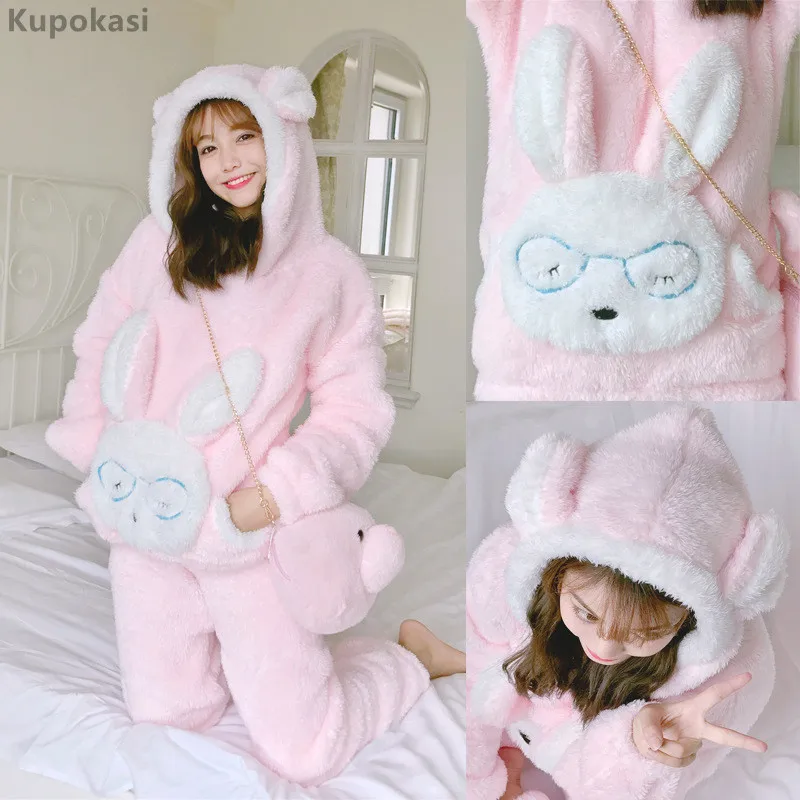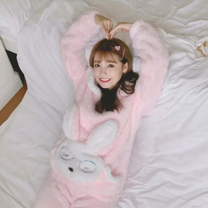 Пижама женская фланелевая, розовая, с кроликами, на осеньзиму