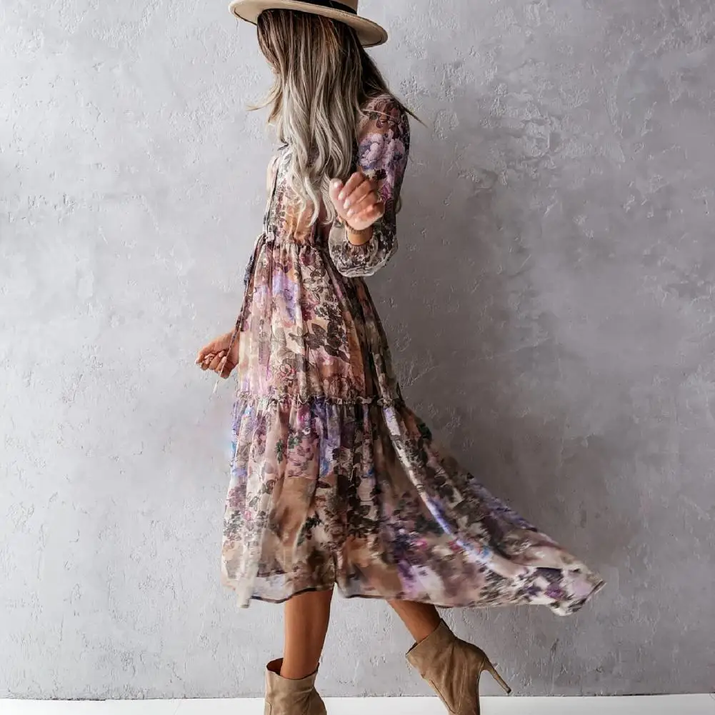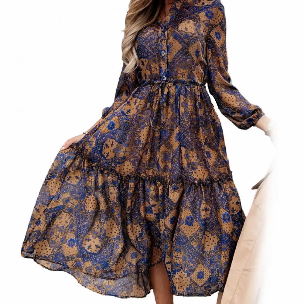 Женское винтажное платье-рубашка с цветочным принтом, V-образным вырезом и длинным рукавом