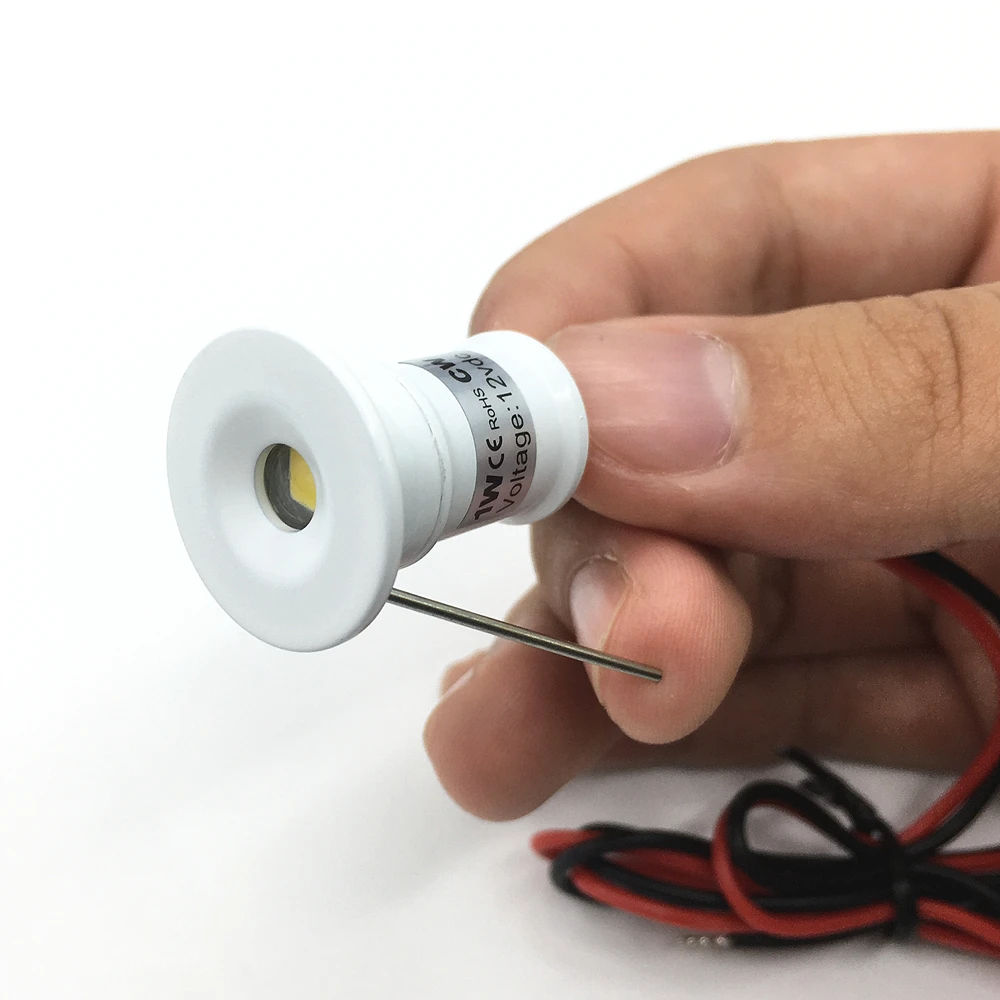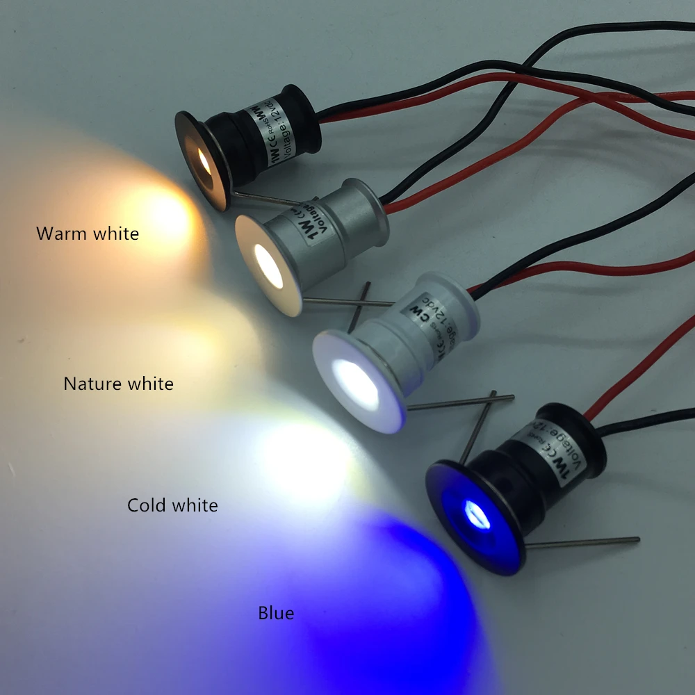 Features of LED SpotlightPower:1W Lumen: 95 LMInput Voltage:DC12V Light Beam Angle:30° Or 120° Protection Class: IP 65 Waterproof Main Material: AluminumBody Shell: Silver, Black, WhiteBody Size: D20mm x25mm Cable:47cm Teflon CableWorking Temperature: -25°C~+45°CWarranty: 3 years with CE and ROHS, chip life span is 35000hrsColor Temperature: Warm White(2700-3000K),Nature White(4000-4500K),Cold White(6000-6500K) ,Blue, Green,Red,RGBUsage: Room Decorative Light, KTV Rooms, Stairs Indicating Light, Cabinet Showcase Light, and other DIY Design Lighting