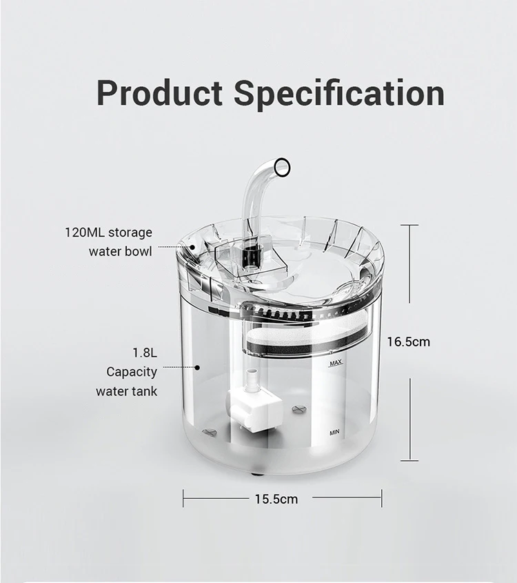 Материал: пищевой ПКЦвет товара: полностью прозрачный (пусть ваши питомцы будут четко видеть воду)Максимальная емкость: 2 литра (67 унций)Размер изделия: прибл. 16,5x16,5x15,5/6.5x6.5x6.1in (Д * Ш * В)Вес изделия: 600 гВремя замены фильтра: один раз в месяц для достижения хорошего эффекта фильтрации. (Замените фильтрующий элемент один раз в 2 месяца в режиме Интеллектуального датчика)Советы: Регулярно очищайте насос, чтобы продлить срок службыТеплые Примечания:О датчике движения, который может адсорбироваться только на глянцевой и гладкой поверхности, матовая стена или пол не соответствуют условиям. (он может быть адсорбирован к корпусу фонтана WF060)